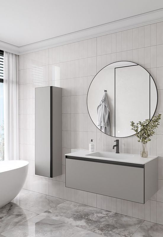 Главной особенностью коллекции являются обрамления фасадов из алюминия в самых трендовых цветах: графит, матовое золото, матовый черный и серебро. Эти обрамления идеально дополняют сантехнику в ванной комнате.