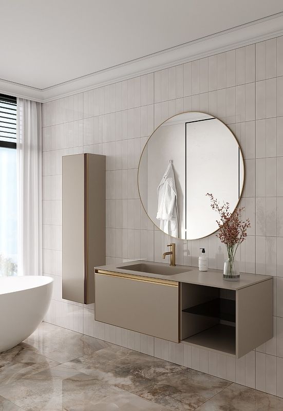 Главной особенностью коллекции являются обрамления фасадов из алюминия в самых трендовых цветах: графит, матовое золото, матовый черный и серебро. Эти обрамления идеально дополняют сантехнику в ванной комнате.