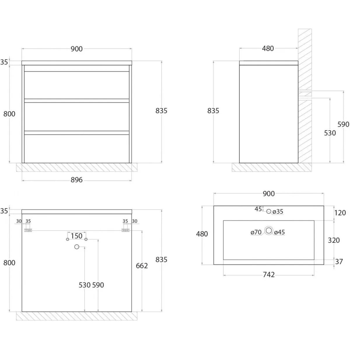 FAMILY База под раковину напольная с тремя выкатными ящиками, Pino Bianco, 900x480x845, FAMILY-900-3C-PIA-PB