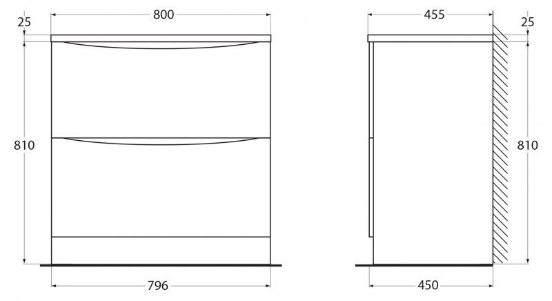 Дополнительная информация: база оснащена доводчиками скрытого монтажа с системой Soft close (плавного закрывания) - ;C врезными (фрезерованными) ручками в плоскости фасада; раковина сифоном не комплектуется