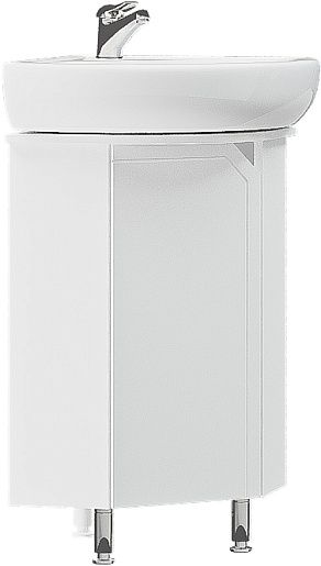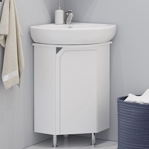 Тумба под раковину Corozo Сириус 40, напольная, белая, SD-00001645Функциональность и эргономика эксплуатации – отличительные черты коллекции мебели для ванных комнат СИРИУС. Тумба угловая, имеет 1 распашную дверь, позади дно. Сверху крышка с вырезом под раковину. Тумба стоит на 2 металлических опорах и 1 пластиковой. Корпус ЛДСП белый, фасады МДФ в белой плёнке ПВХ. Фурнитура с лицевой стороны фасадов отсутствует, вместо нее предусмотрены интегрированные ручки в виде эргономичной фрезеровки под 45 градусов, которую обрамляет декоративная фрезеровка по периметру фасада. Бесшумность и длительный цикл эксплуатации обеспечивают петли с доводчиком.