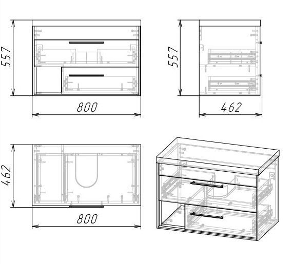 Тумба снабжена выдвижными ящиками, которые укомплектованы шариковыми направляющими с системой плавного закрывания. Дополнительное открытое отделение с полкой позволит расширить место для хранения и предоставляет быстрый доступ к ванным принадлежностям.