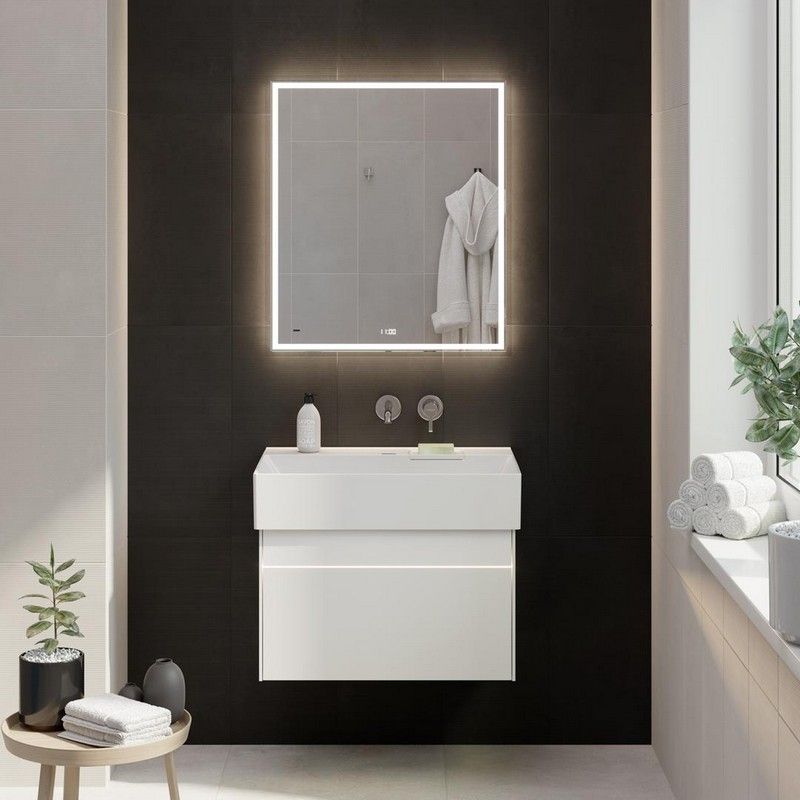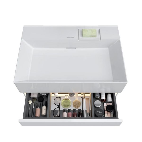 Подвесная тумба Logica — это детально проработанный дизайн и вдохновляющие технологические возможности. Так, при приближении к тумбе автоматически загорается подсветка между двумя выдвижными ящиками. Дистанцию срабатывания подсветки можно настроить с помощью инструкции из комплекта поставки. Фасады и корпус выполнены из МДФ в цвете «Белый белоснежный»: верхний фасад — глянцевый, нижний фасад и корпус — матовые. Тумба имеет два выдвижных ящика с открытием Push to open, с внутренней отделкой «Лён Антрацит». Верхний ящик, благодаря нестандартному расположению сифона, содержит больше полезного пространства и удивляет стеклянной вставкой в основании: через такое «окно» снизу струится свет, эффектно подчёркивая содержимое. В комплектацию тумбы входят крепление, гарантийный талон, инструкция по установке, инструкция по регулировке подсветки и открытия ящиков.