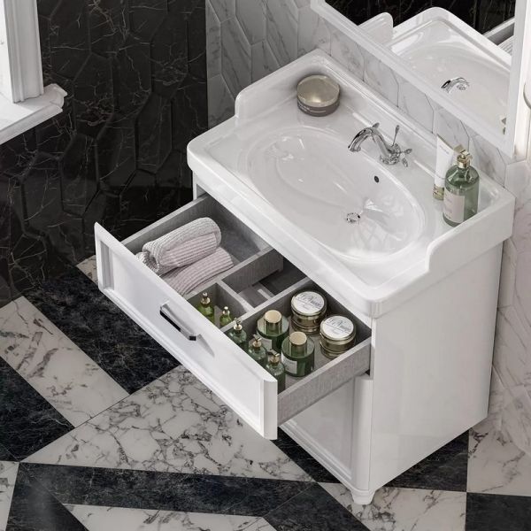 Тумба POMPEI с тремя ящиками — отличный способ рационально использовать пространство под раковиной. Вместительные ящики позволят организовать раздельное хранение текстиля и аксессуаров для ванной: каждая вещь будет на своём месте. В мебели использована качественная амортизирующая фурнитура. Обновлённые тумбы POMPEI легко узнать по характерному классическому дизайну с фасадом, скруглённым по двум сторонам. Открыв любой ящик, мы увидим, что он стал более объёмным и выполнен с отделкой «лён», характерной для большинства новых моделей мебели KERAMA MARAZZI.