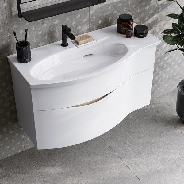 Белая матовая тумба с гнутым фасадом с левым расположением овальной зоны, ширина 100 см. Внутренняя планка окрашена в песочный цвет. Тумба представлена в версии с двумя ящиками, снабжена врезными удобными ручками, которые образуют на фасаде изящную «улыбку». Благодаря смещенному сливу раковины, верхний ящик не имеет вырез под сифон. Сочетается с раковиной Riva с левым расположением чаши.