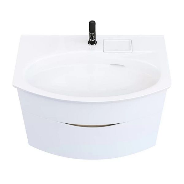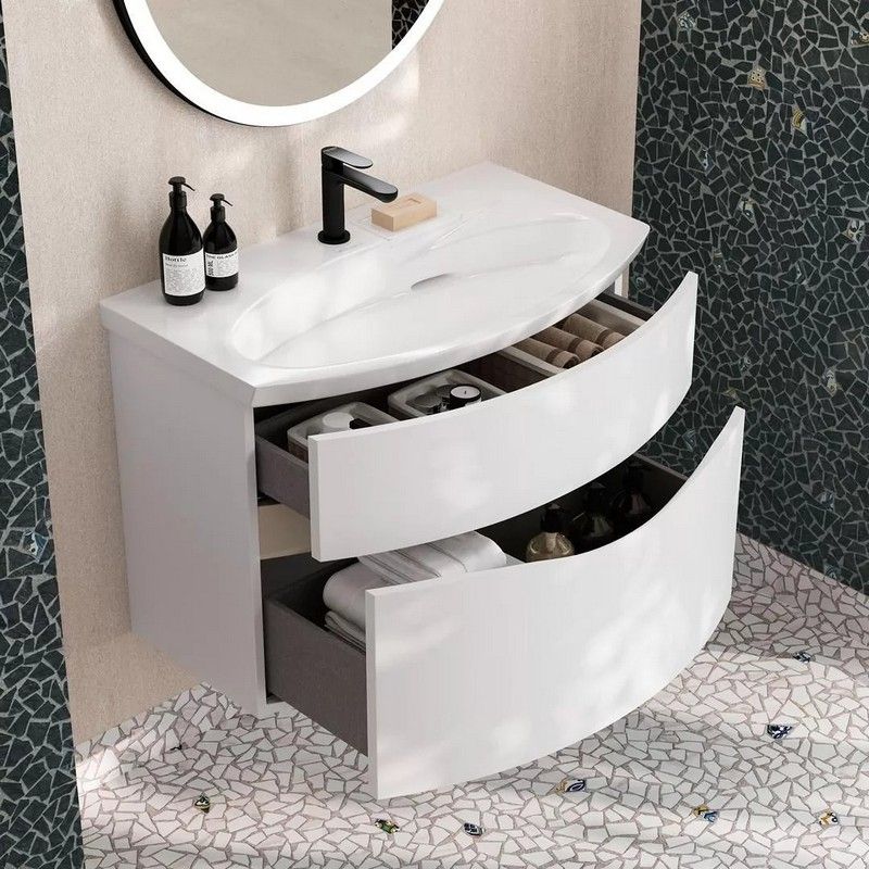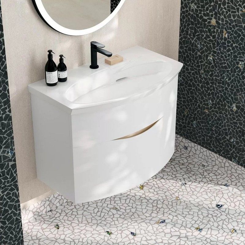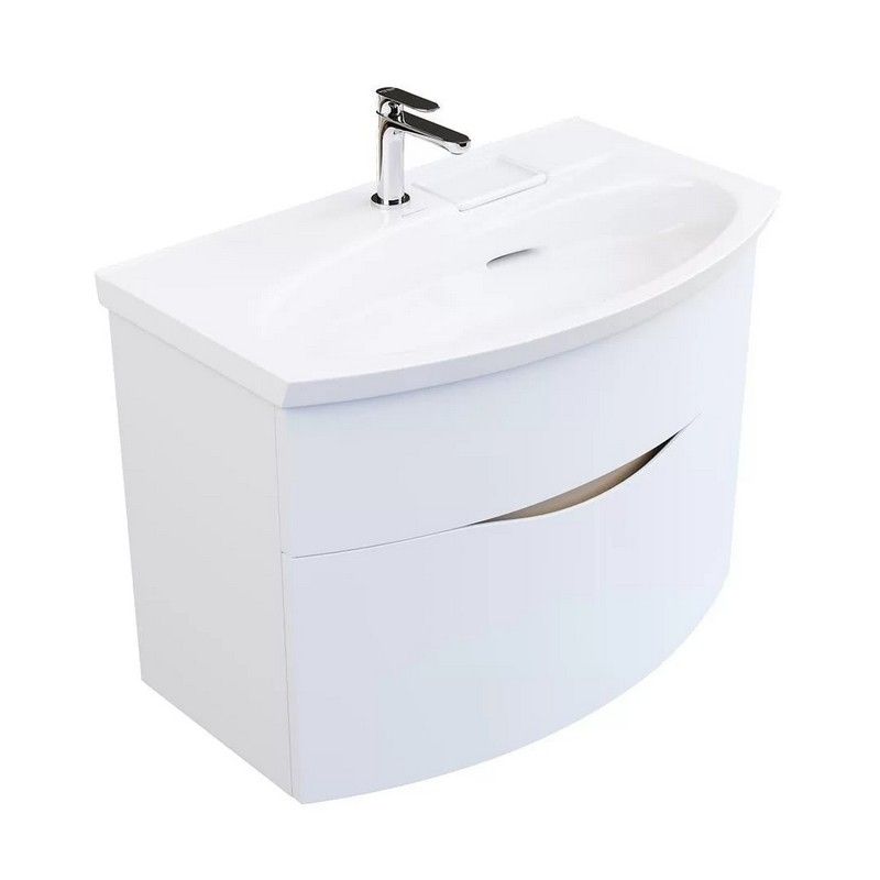 Белая матовая тумба с гнутым фасадом с центральным расположением овальной зоны, ширина 80 см. Внутренняя планка окрашена в песочный цвет. Тумба представлена в версии с двумя ящиками, снабжена врезными удобными ручками, которые образуют на фасаде изящную «улыбку». Благодаря смещенному сливу раковины, верхний ящик не имеет вырез под сифон. Сочетается с раковиной Riva с правым расположением чаши.