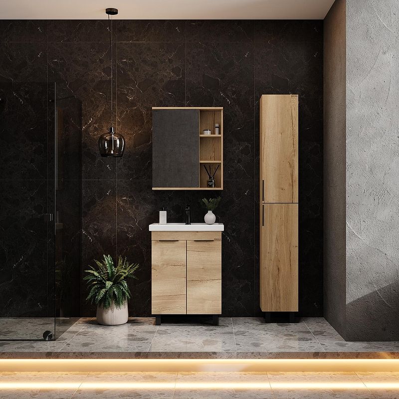 Напольная тумба для ванной комнаты Onika Легран 70 - это сочетание насыщенного древесного декора и благородства металла: роскошная текстура и натуральный цвет дуба дают теплоту, а черная матовая фурнитура добавляют урбанизма и солидности.