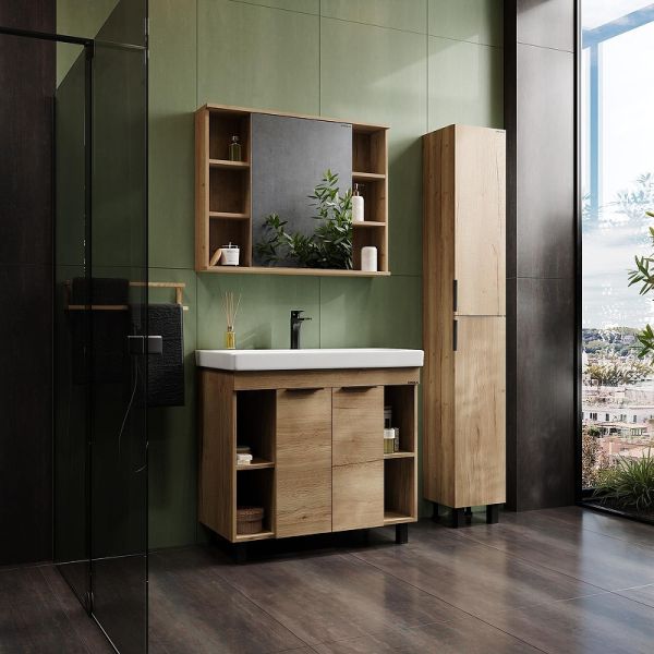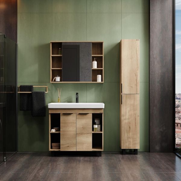 Напольная тумба для ванной комнаты Onika Легран 90 - это сочетание насыщенного древесного декора и благородства металла: роскошная текстура и натуральный цвет дуба дают теплоту, а черная матовая фурнитура добавляют урбанизма и солидности.