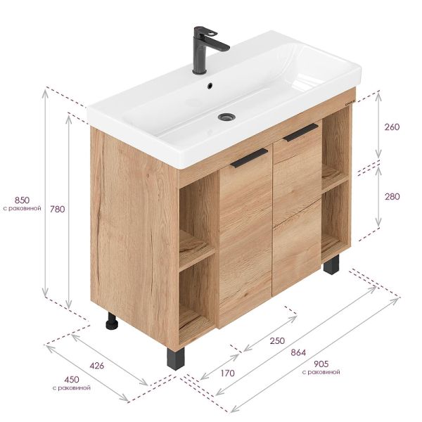 Размеры тумбы без учета раковины и ножек 86x43x68 см.