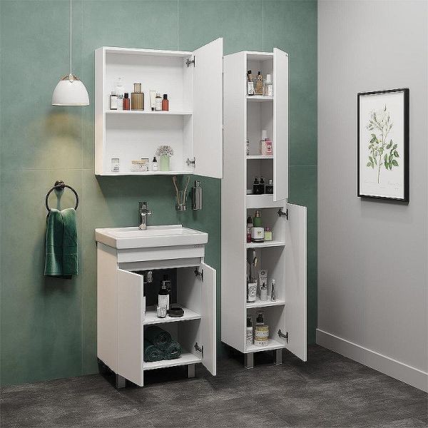 Тумба имеет белый глянцевый фасад и строгие формы без декора. За дверцами с интегрироваными ручками скрывается пространство с полкой для размещения необходимых бытовых принадлежностей.