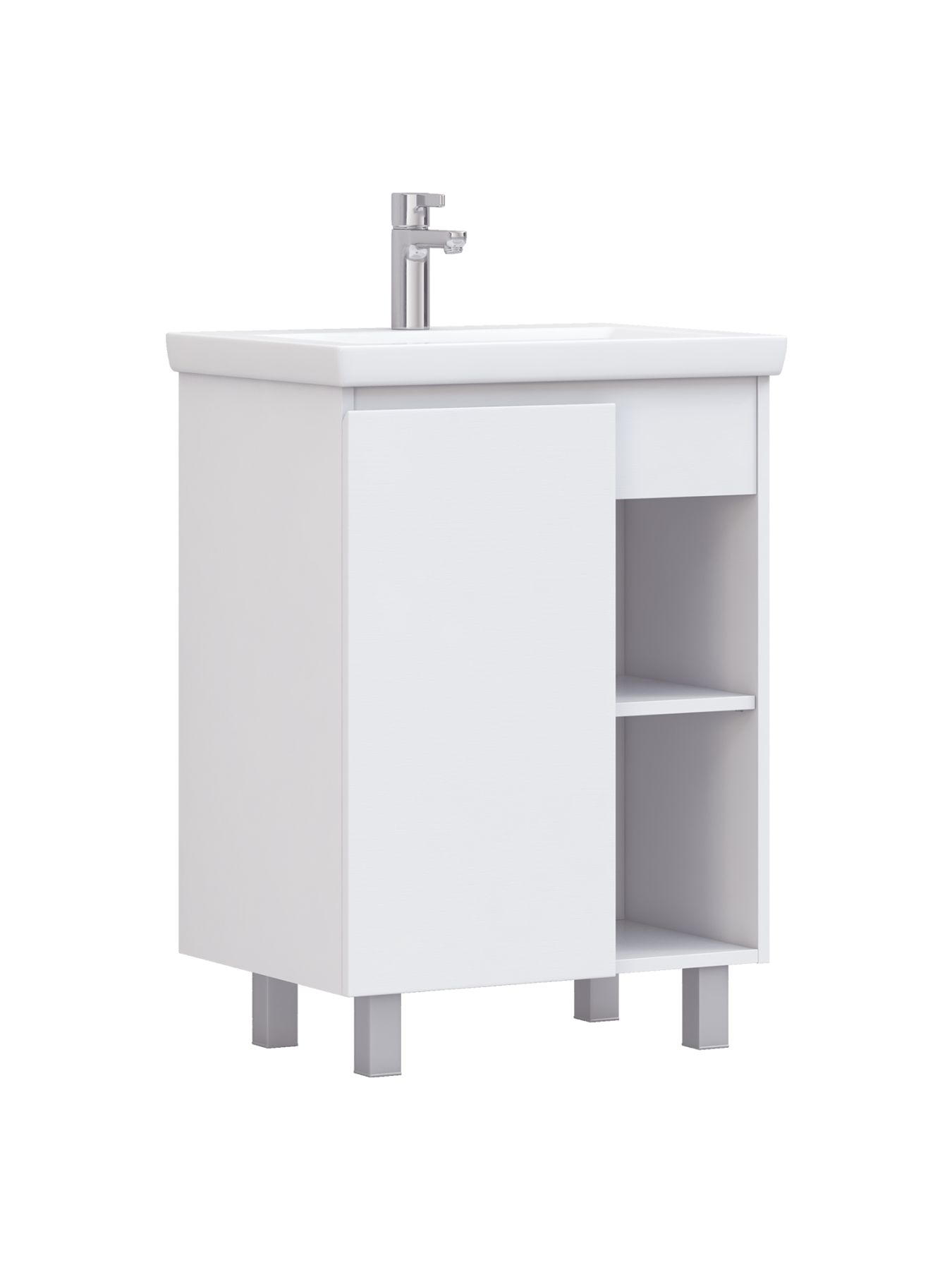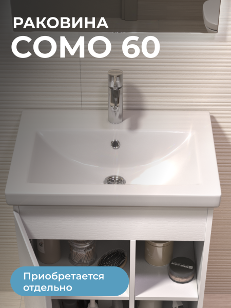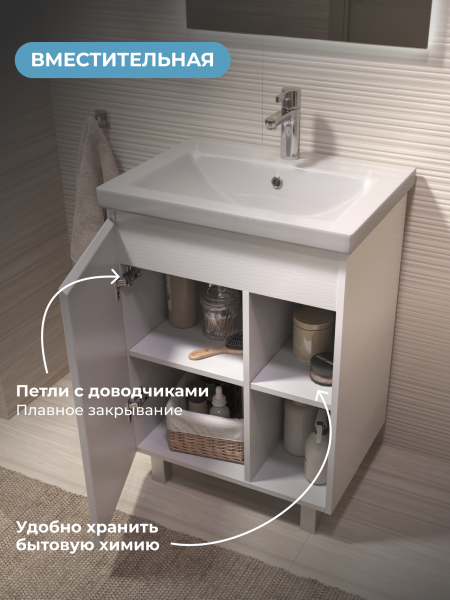Тумба Milos 60, напольная, 1 дверца, белая (под раковину Como 60). Оснащение: 1 дверца, петли с механизмом доводчика, 2 полки ЛДСП, 4 опоры квадратные регулируемые. Колекция VIGO MILOS: петли с доводчиком, полки из влагостойкой ЛДСП, толщина 16 мм, интегрированные ручки, декор материала с имитацией под дерево.
