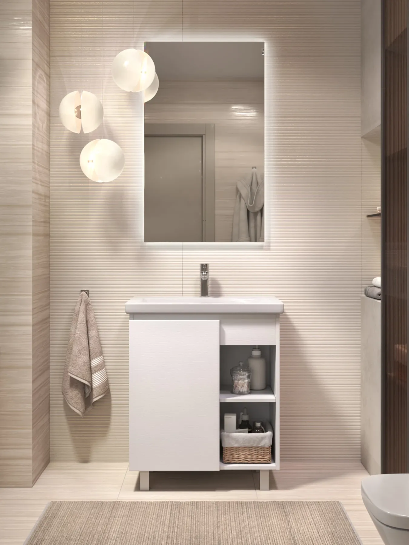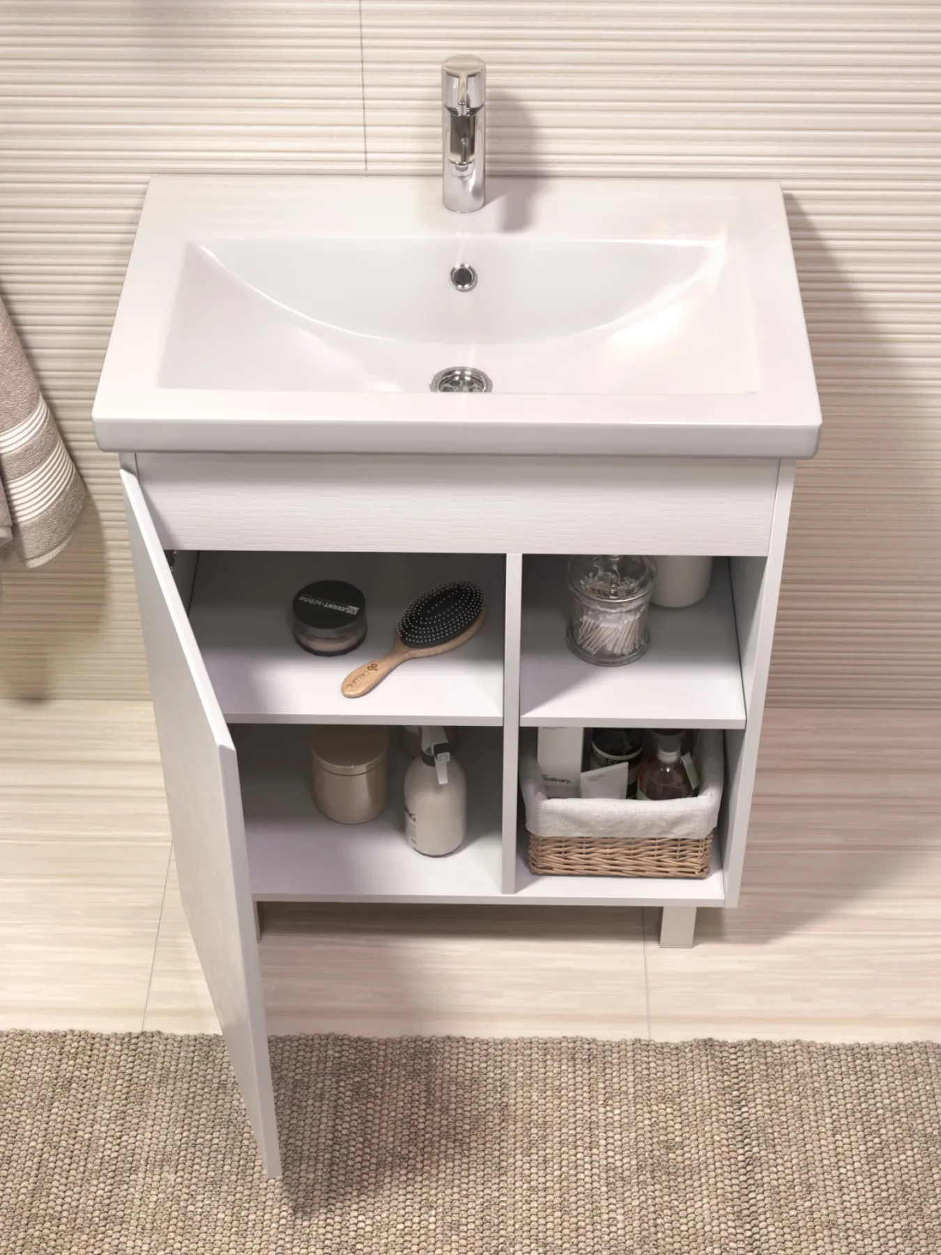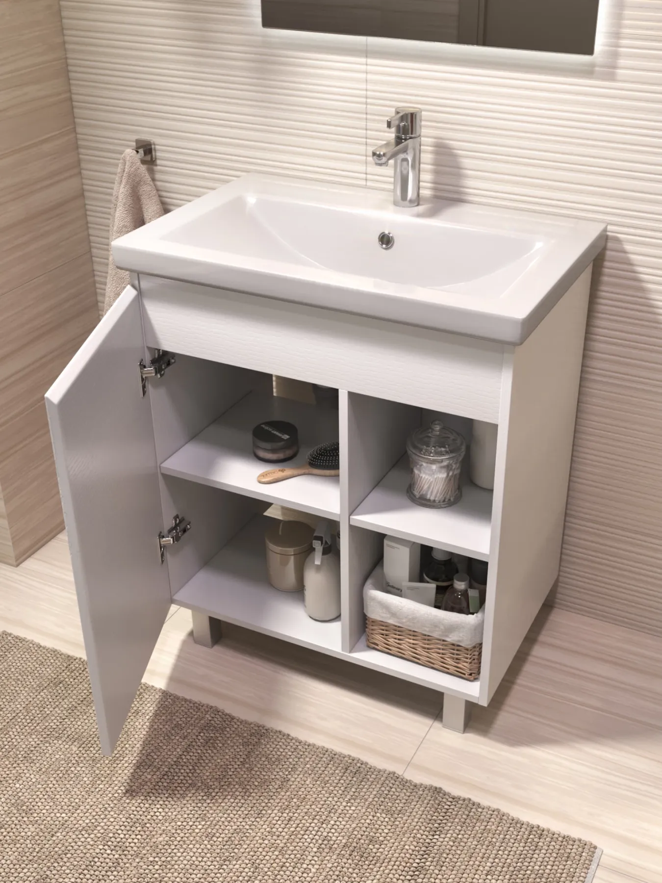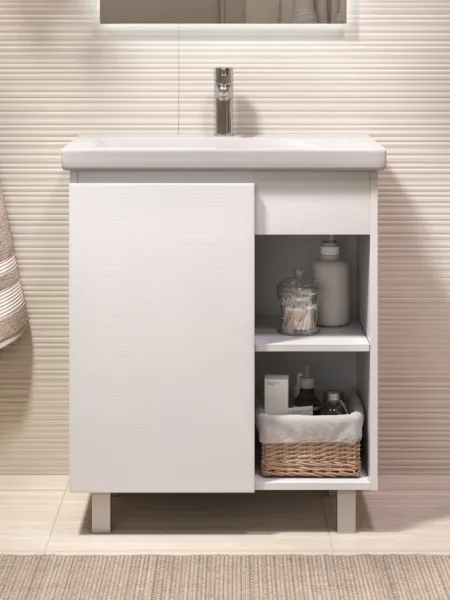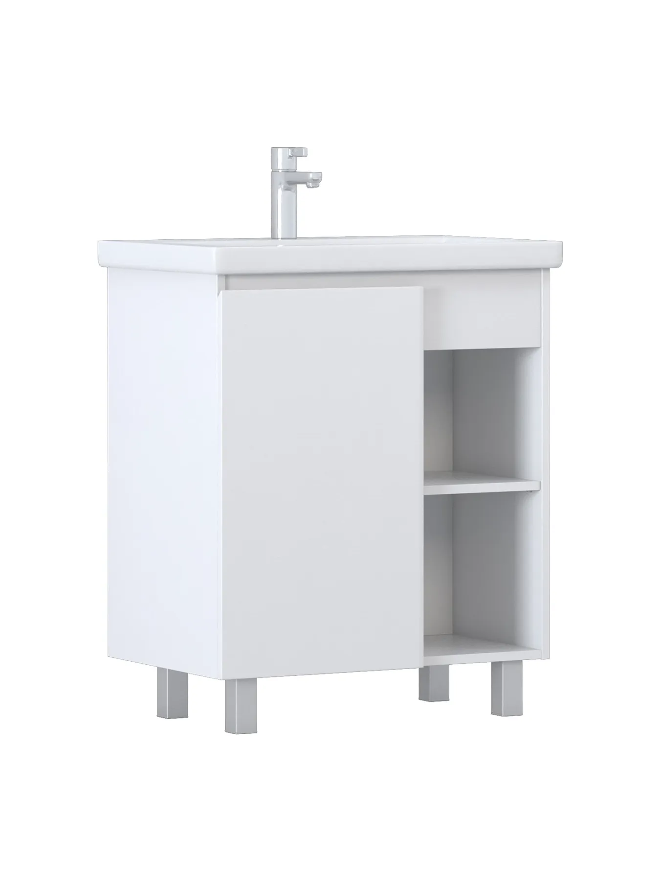 Тумба Milos 70, напольная, 1 дверца, белая (под ракоовину Como 70). Оснащение: 1 дверца, петли с механизмом доводчика, 2 полки ЛДСП, 4 опоры квадратные регулируемые. Колекция VIGO MILOS: петли с доводчиком, полки из влагостойкой ЛДСП, толщина 16 мм, интегрированные ручки, декор материала с имитацией под дерево.