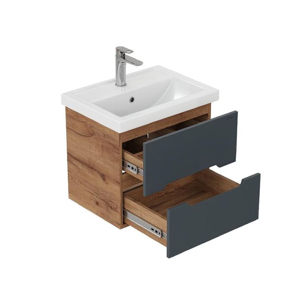Подвесная тумба Onika Айленд 60 – это отличное решение для ванной комнаты, сочетающее стиль и практичность. Тумба впишется в любой интерьер благодаря трендовому сочетанию матового графита и золотого дуба, а также поможет эффективно организовать пространство, что особенно важно в небольших ванных комнатах.
