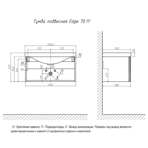 Тумба под раковину подвесная Velvex Edge tp.EDG.9696.70.1Y графит, 70 см