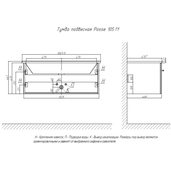Тумба под раковину подвесная Velvex Posse tp.POS.OSK.105.1Y верде, 105 см: 1 выдвижной ящик с механизмом плавного закрывания.