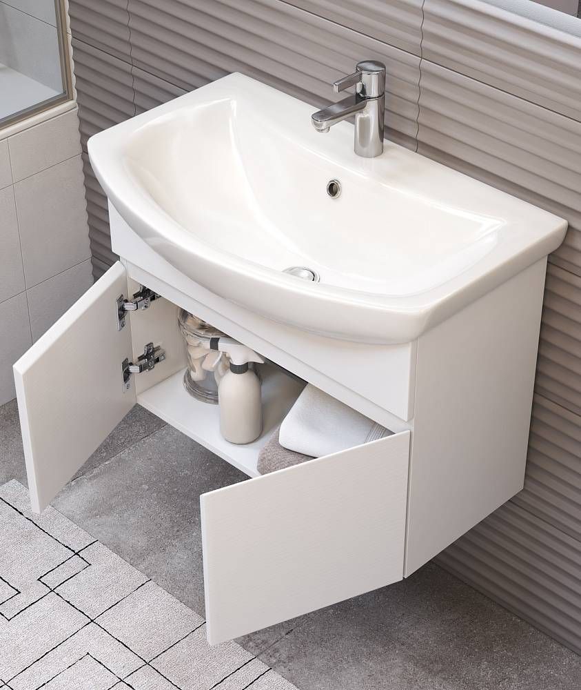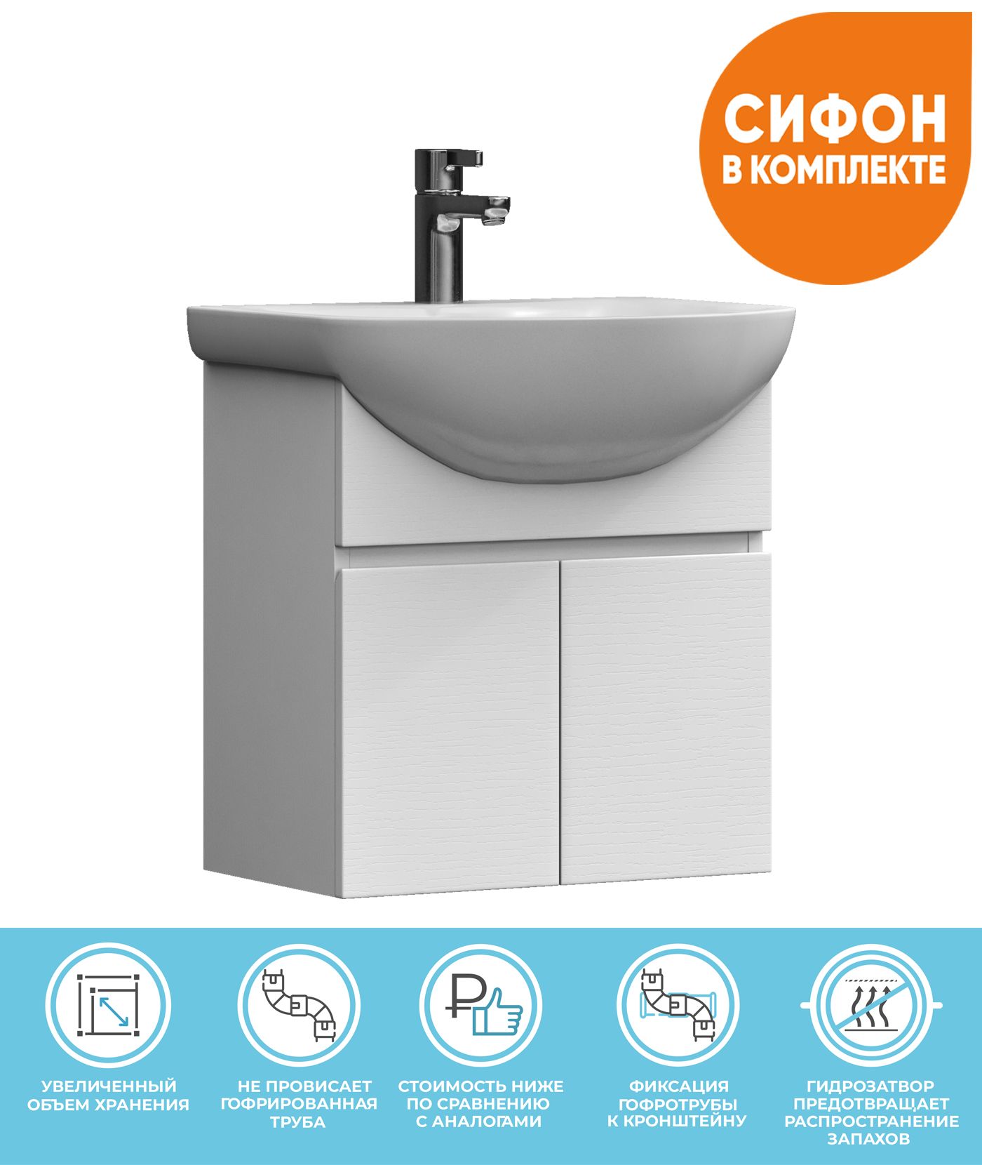 2 дверцы. Специальный сифон Vigo в комплекте.Материал корпуса и фасада: влагостойкая ЛДСПДверцы: петли с механизмом плавного закрыванияОтсутствие лицевой фурнитуры – интегрированная в фасад ручка