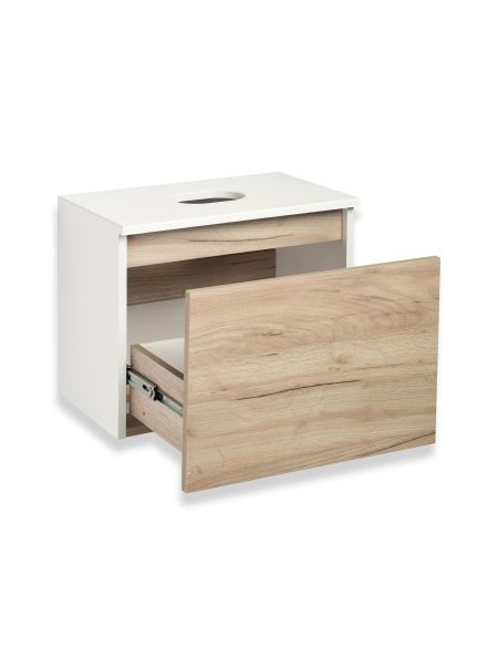 Тумба под раковину в ванную RUNO БАРИ (подвесная) - безупречное сочетание модных тенденций с классическим оформлением ванной комнаты. Тумба под раковину БАРИ оснащена выдвижным ящиком на шариковых направляющих, с системой плавного закрывания. Цвет корпуса классический - белый, при этом цвет фасада в модном цвете – крафтовый дуб, идеально впишутся в любой интерьер ванной комнаты. К тумбе для ванной подойдут умывальники на столешницу: «UNO 24» (24х24см) – очень маленькая модель, идеально подходит для ограниченного пространства в небольших помещениях. Строгая квадратная геометрически правильная форма раковины, усиливает идею лаконичности в дизайне, устанавливается на столешницу, накладным методом. «DUE 38» (38х24см) – маленькая модель, идеально подходит для ограниченного пространства в небольших помещениях. Строгая прямоугольная геометрически правильная форма раковины с округлыми углами, усиливает идею лаконичности в дизайне, устанавливается на столешницу, накладным методом.