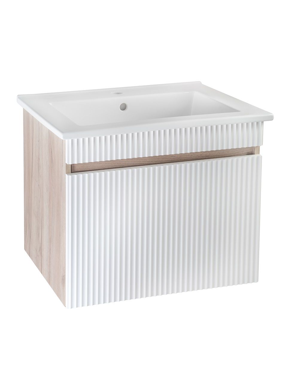 Тумба с раковиной – это изысканность и утончённая роскошь в интерьере. Волнистые рифленые фасады визуально «оживляют» и «приводят в движение» всю обстановку комнаты, сохраняя при этом умиротворение и покой, превосходно сочетаются с древесной фактурой и текстурой необработанного натурального камня корпуса. В комплект мебели входят: тумба с раковиной. Тумба под раковину в ванную Модена оснащена выдвижным ящиком на шариковых направляющих. Цвет корпуса в двух цветах: текстура светлого дерева или необработанного натурального камня. Цвет фасада классический – белый глянец, идеально впишутся в любой интерьер ванной комнаты. Тумба для ванной комплектуется накладной керамической раковиной «Оскар» (660х470 мм). Раковина глубиной 19 см. Мебель для ванной RUNO - красота и практичность в мелочах, комплект мебели Модена – лучший выбор для Вашей ванной комнаты!