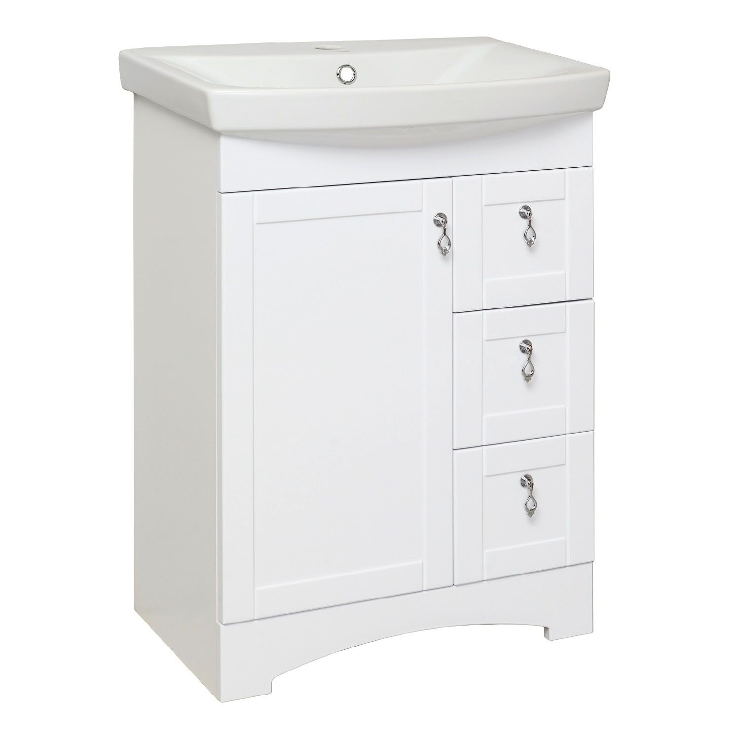 Коллекция мебели «Мерида» выполнена в классическом стиле. Четкие, лаконичные формы и продуманный функционал помогут украсить интерьер любой ванной комнаты. Тумба напольная с одним распашным фасадом и тремя выдвижными ящиками. За левой дверкой - одна внутренняя полка. Ящики - на шариковых направляющих полного выдвижения, петли со встроенным доводчиком, ручки - 4шт, ножки пластик - 4шт (скрыты за нижней фальш-панелью)