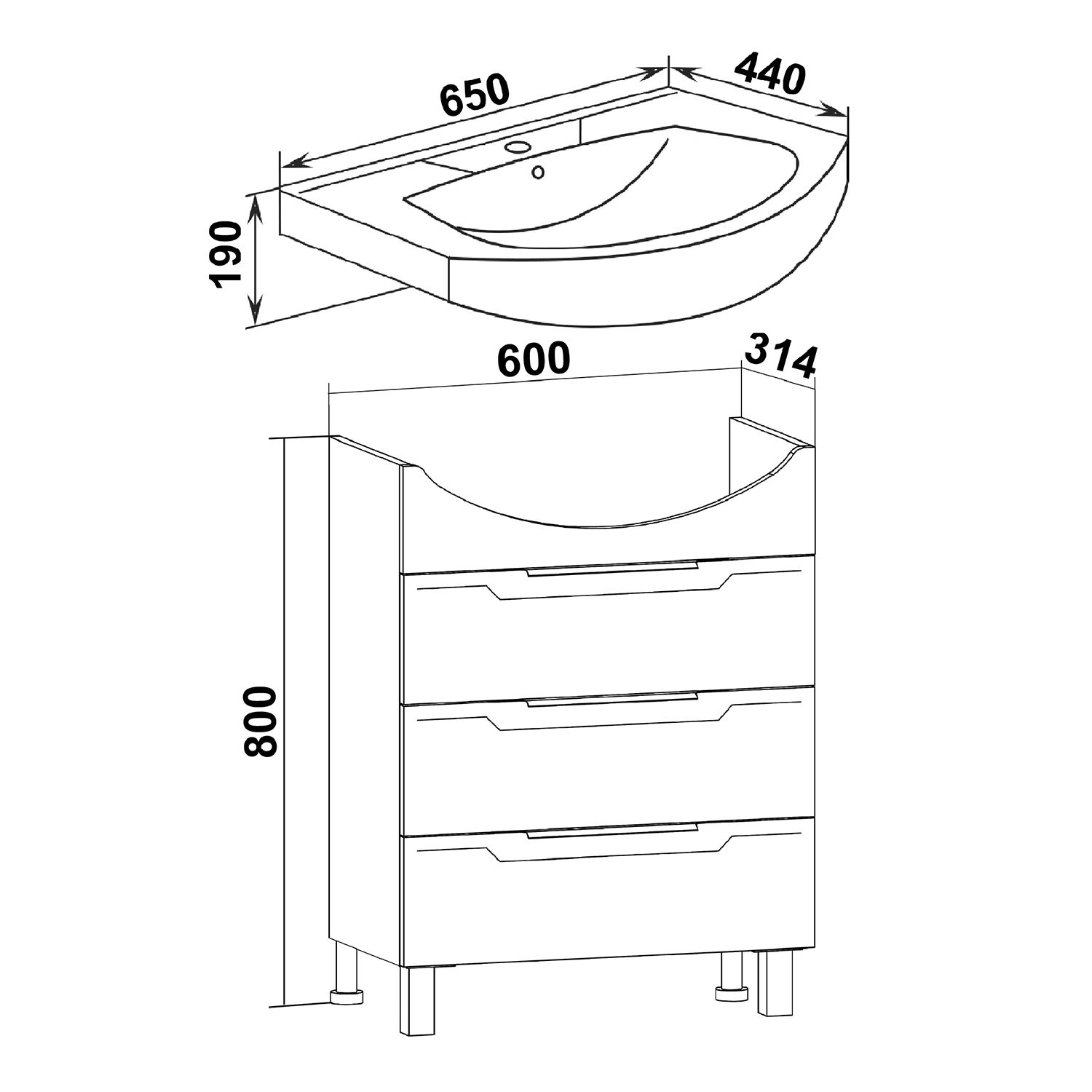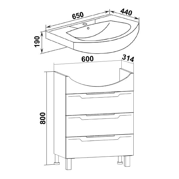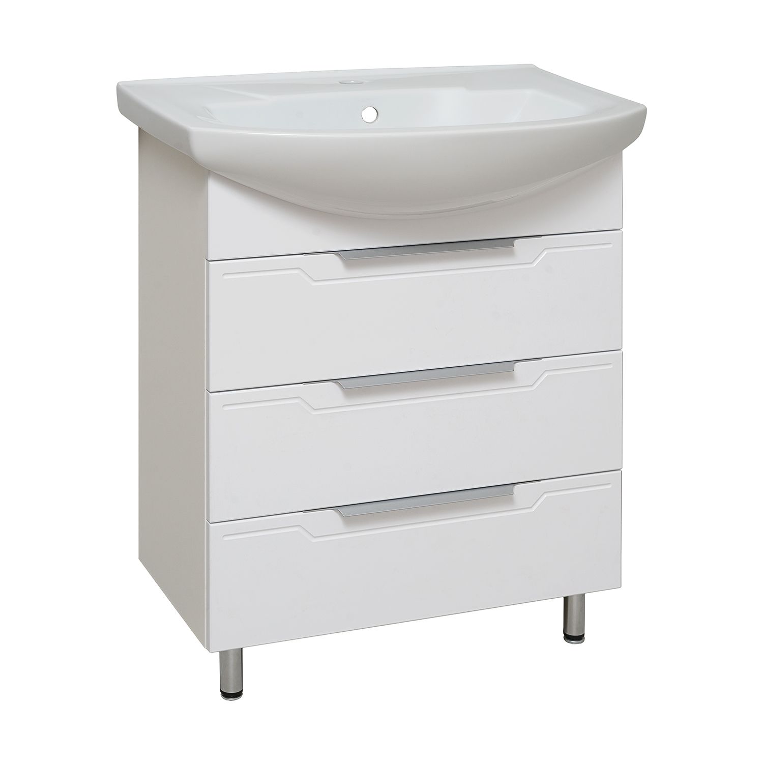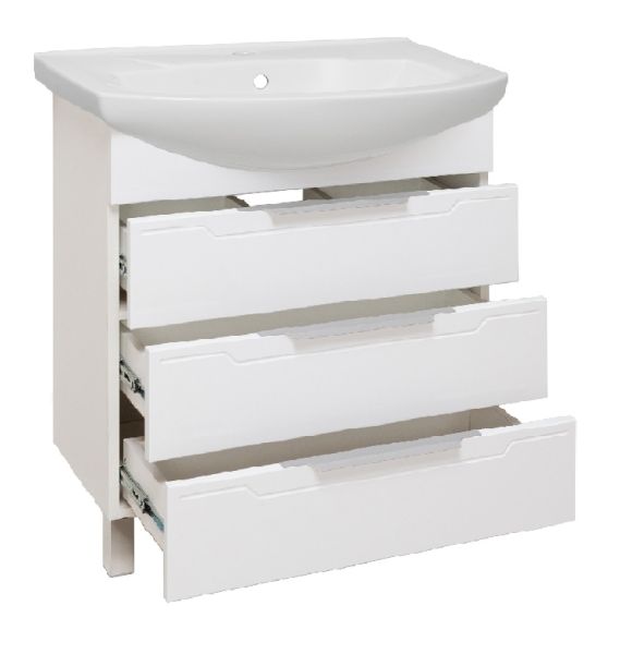Тумба под умывальник напольная с тремя выдвижными ящиками на шариковых направляющих полного выдвижения. Ручки профильные - 3шт, ножки хром - 2шт, ножки пластик - 2шт.