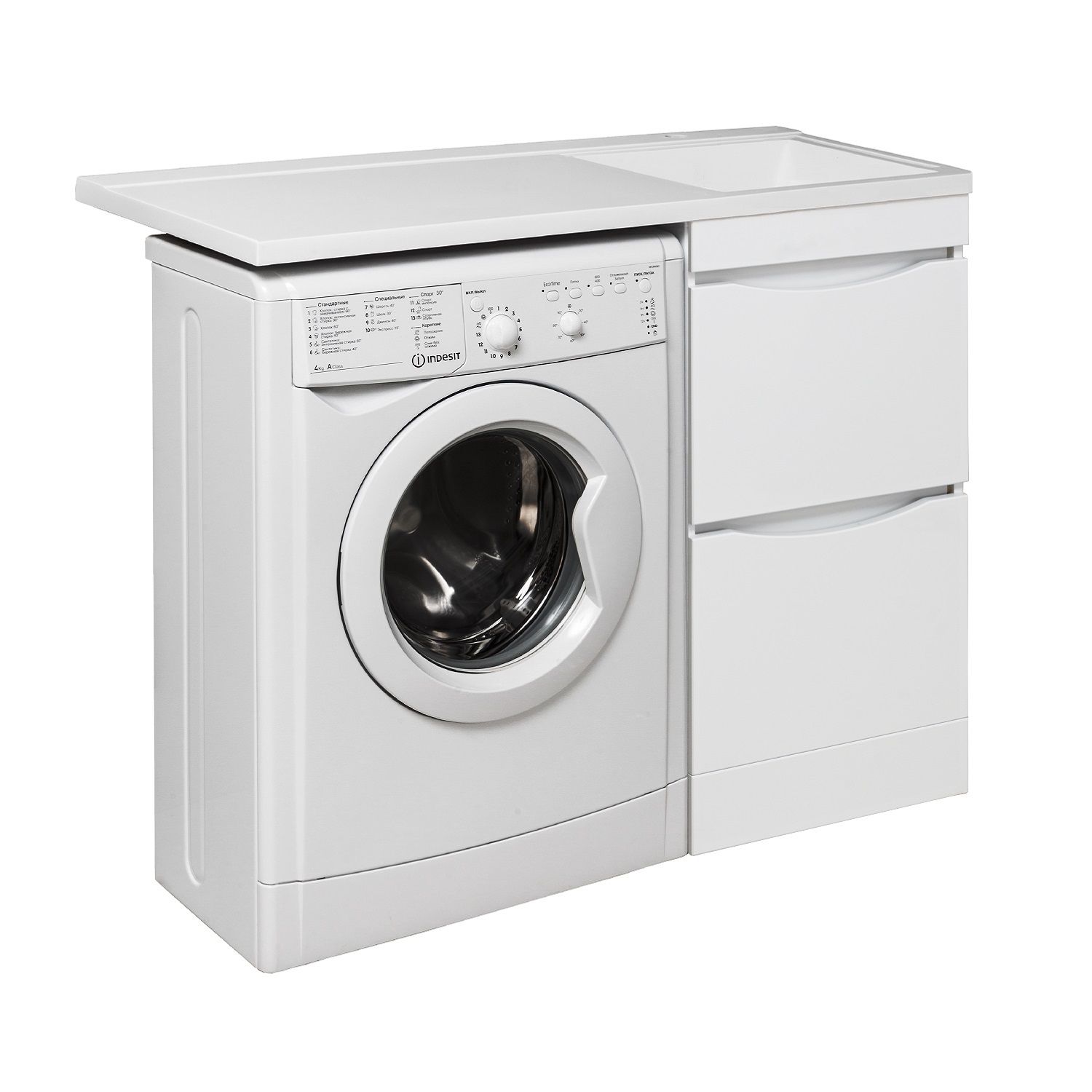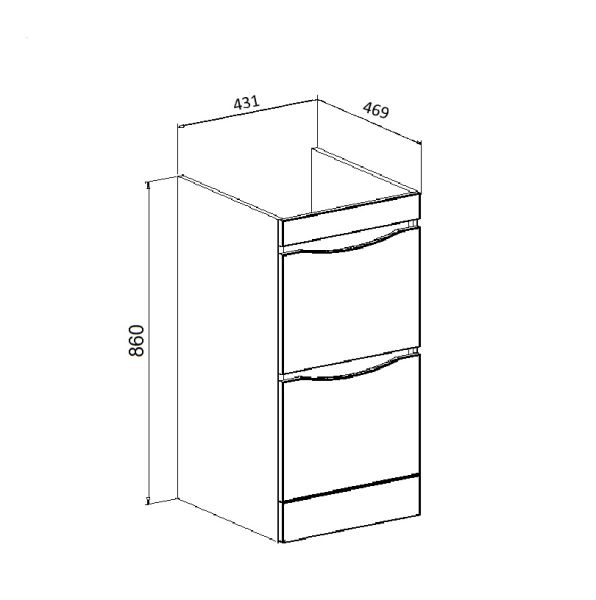 Тумба под умывальник напольная с двумя выдвижными ящиками на шариковых направляющих скрытого монтажа с доводчиком. Устанавливается на 4-е пластиковые опоры, скрытые за нижней съемной фальшь-панелью. Комплект предусматривает установку стиральной машины под крылом умывальника слева от тумбы. Умывальник из литьевого мрамора "Gamma 105 лайт" устанавливается на тумбу и кронштейн.