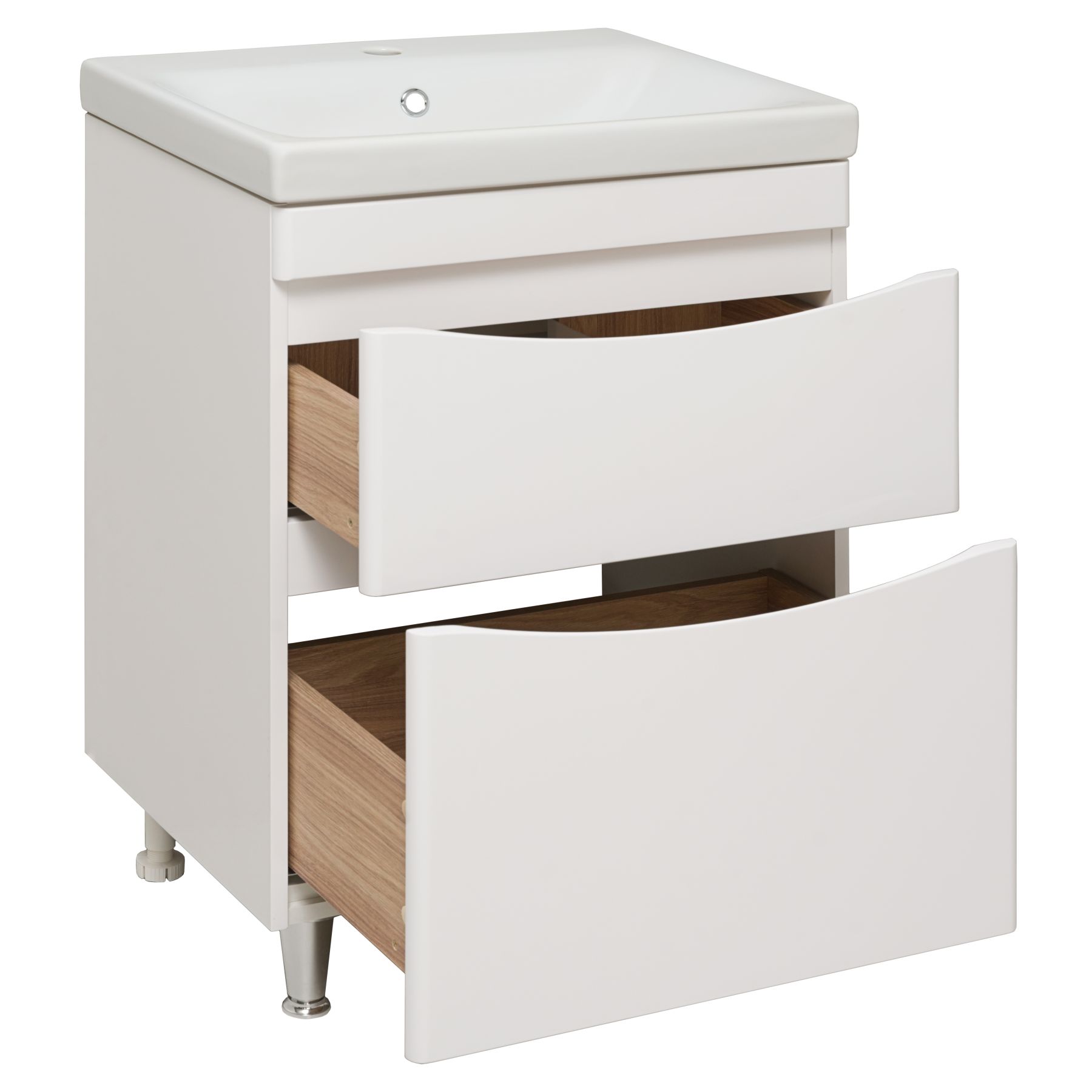 Тумба с раковиной для ванной комнаты RUNO АФИНА - безупречное сочетание модных тенденций с классическим оформлением ванной комнаты. Тумба под раковину в ванную АФИНА имеет два выдвижных ящика на шариковых направляющих, оснащенных системой плавного закрывания. Цвет фасада универсальный - белый, идеально впишется в любой интерьер ванной комнаты. В комплекте идут 2 хромированные и 2 пластиковые ножки. Тумба для ванной комнаты комплектуется накладной керамической раковиной "Moduo" (605х460 мм). Раковина имеет глубину 17,5 см. Мебель для ванной RUNO - красота и практичность в мелочах!