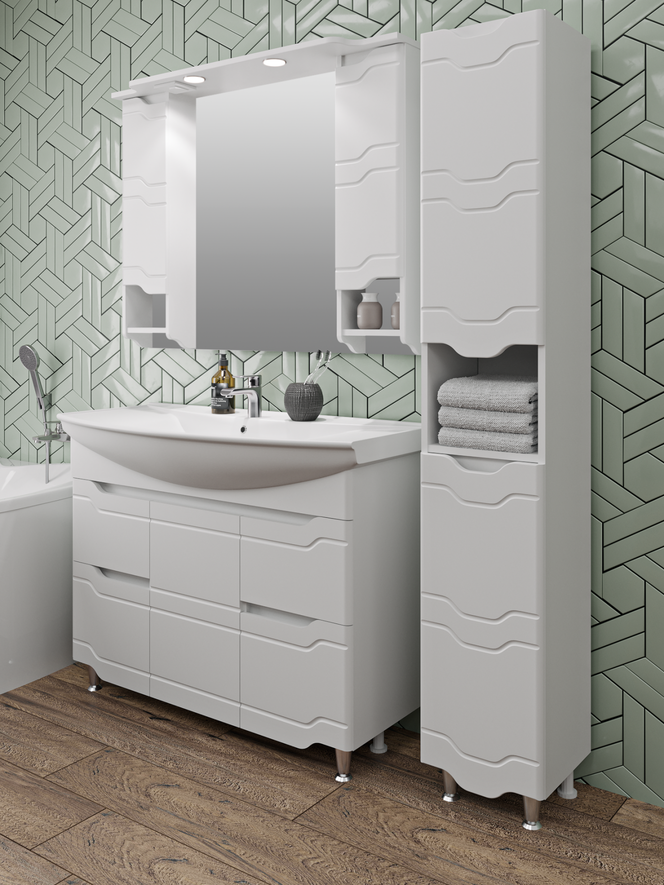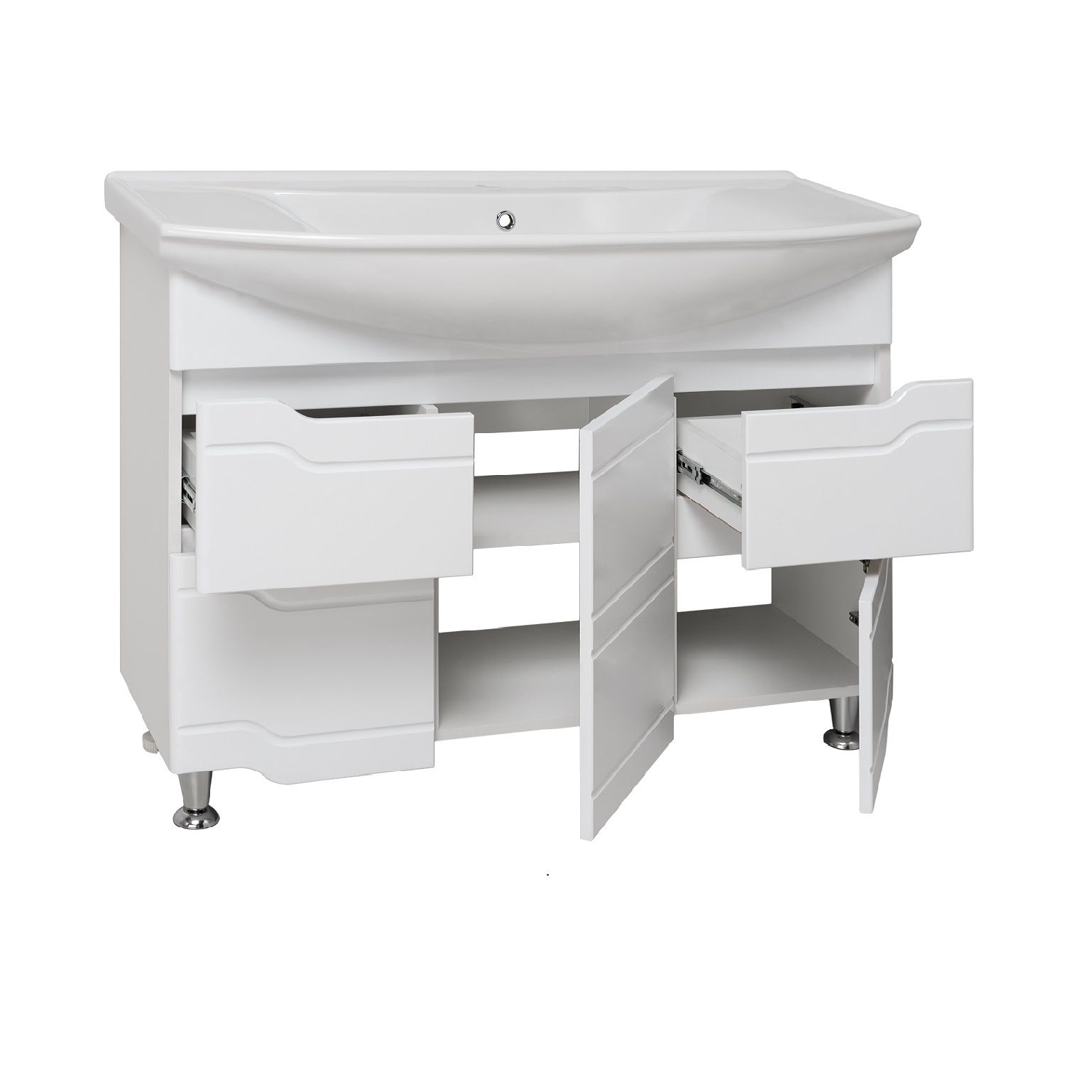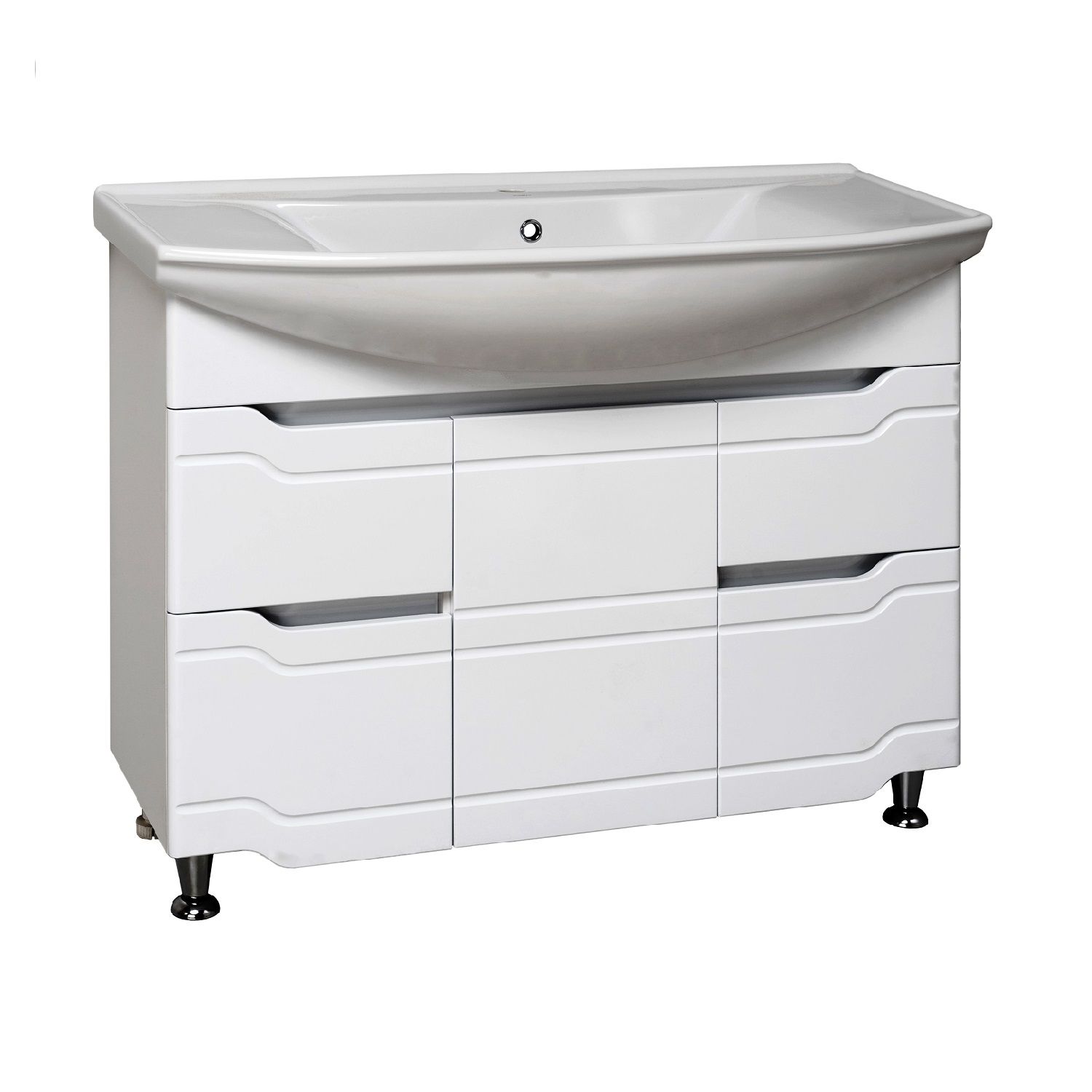 Тумба под умывальник на ножках с тремя распашными фасадами и двумя боковыми выдвижными ящиками. За центральной дверкой -одна внутренняя полка. Петли со встроенным доводчиком, ящики на шариковых направляющих полного выдвижения, ножки хром - 2шт, ножки пластик -2шт.
