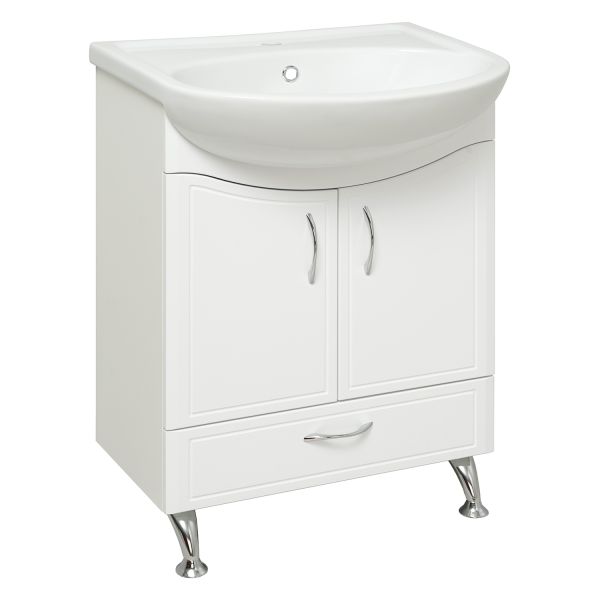 Тумба под умывальник напольная с двумя распашными фасадами и нижним выдвижным ящиком. За фасадами - одна встроенная полка. Петли со встроенным доводчиком, ящик - на шариковых направляющих, ручки - 3шт, ножки хром - 2шт, ножки пластик -2шт.