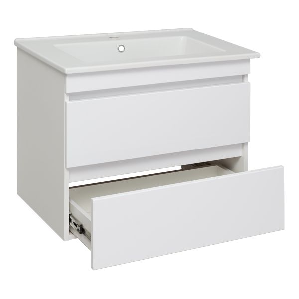 Коллекция мебели "Манхэттен" выполнена в современном стиле. Корпус изделий изготовлен из белого ЛДСП, а фасады облицованы глянцевой пленкой ПВХ белого цвета. Тумба под умывальник подвесная с двумя выдвижными ящиками на шариковых направляющих с доводчиком. Навесы - 2шт.