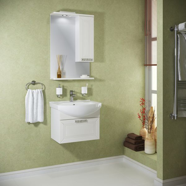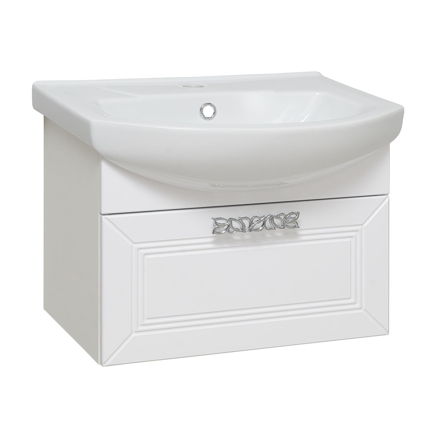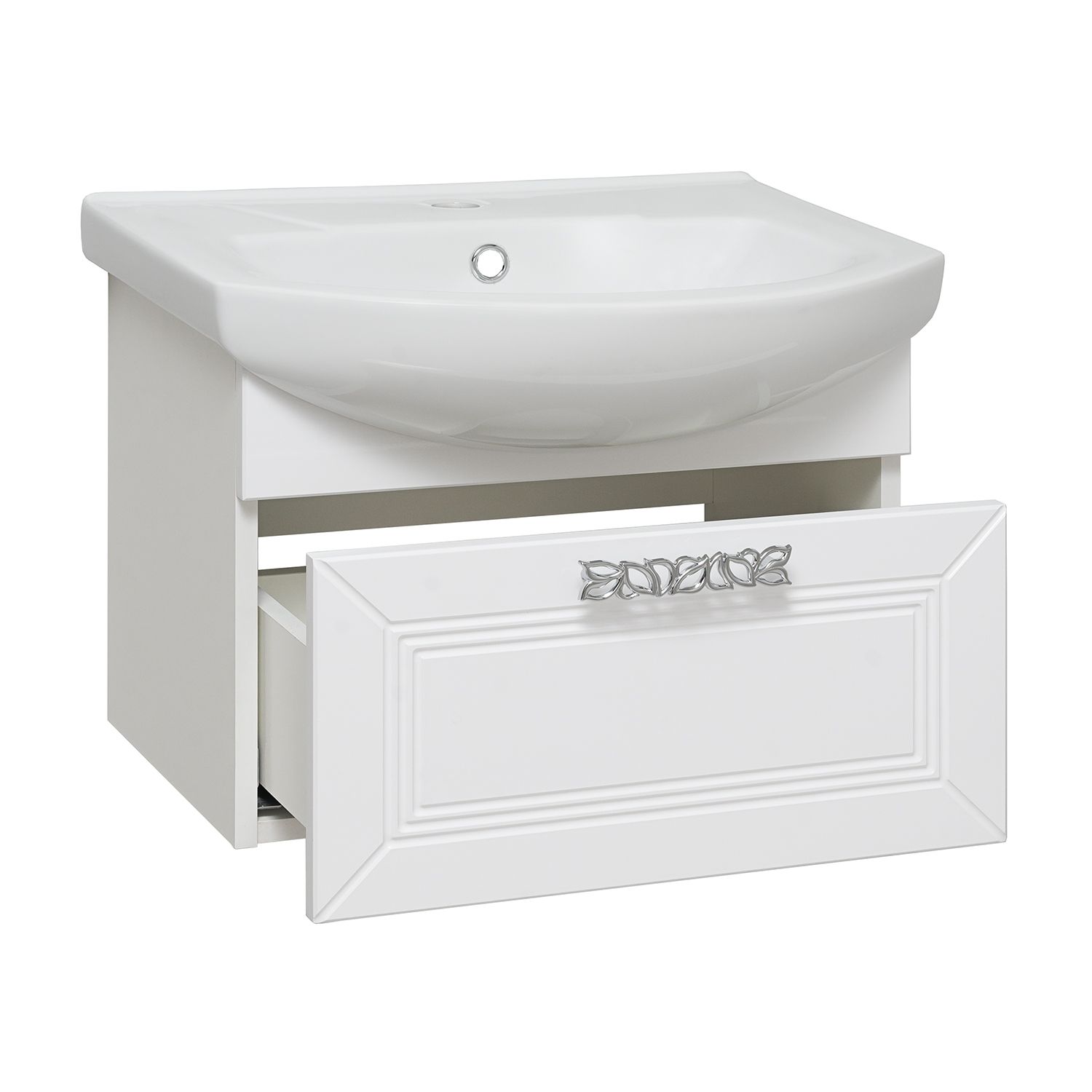Тумба под умывальник подвесная с одним выдвижным ящиком. Ящик - на шариковых направляющих скрытого монтажа с доводчиком. Ручка - 1шт , навесы -2шт.