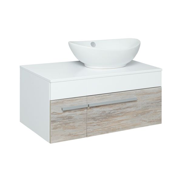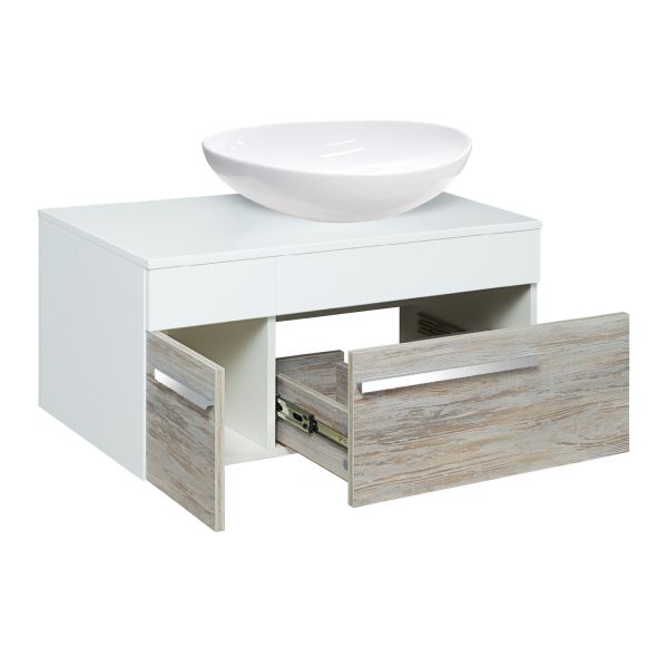 Тумба подвесная под умывальник с одной распашной дверкой и выдвижным ящиком справа. Благодаря универсальному отверстию на столешнице тумба может комплектоваться различными вариантами накладных раковин: модель «Caspia» 60 TM Cersanit с вместительной чашей овальной или квадратной формы или раковина «Гамма» 56 ТМ Kirovit c глубокой чашей и высокими бортиками, которые отражают современные тренды в дизайне. Ящик на шариковых направляющих, оснащенных системой плавного закрывания. Петли со встроенным доводчиком.