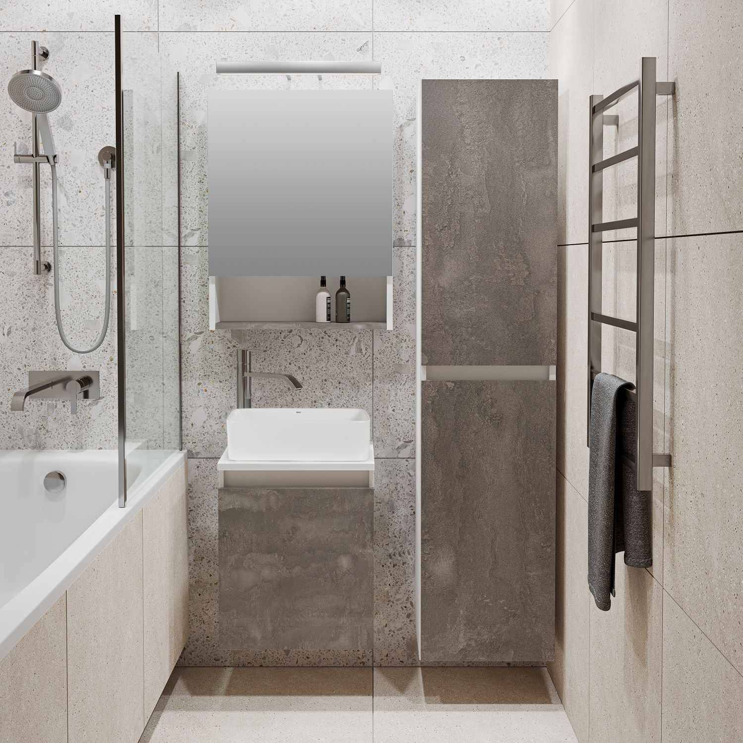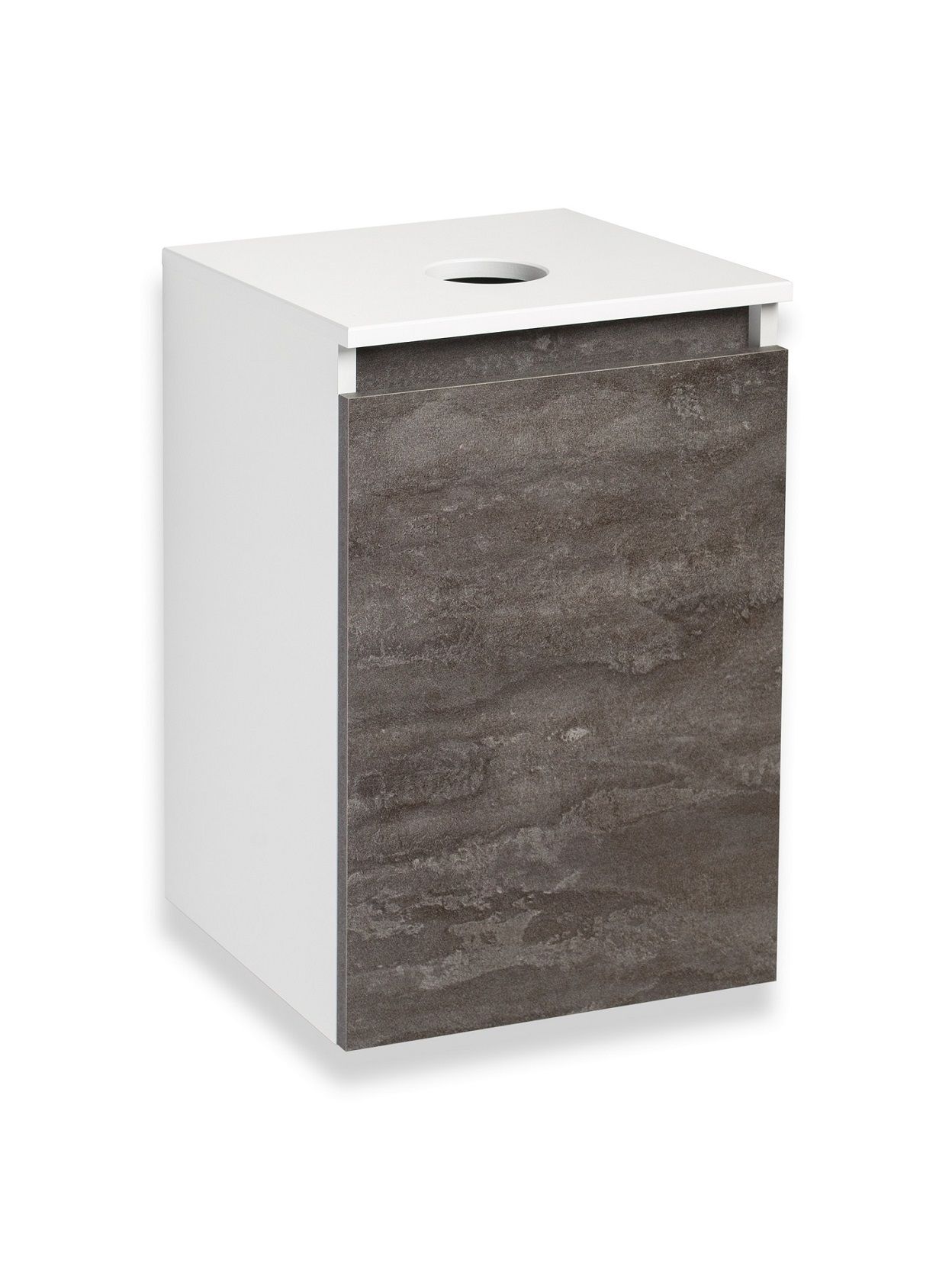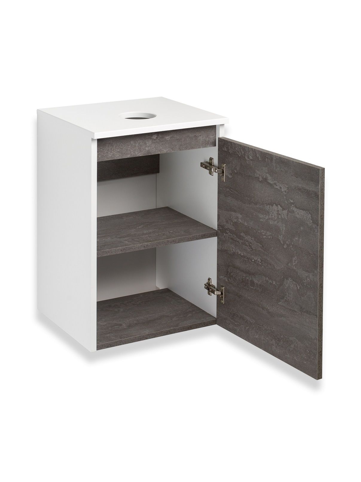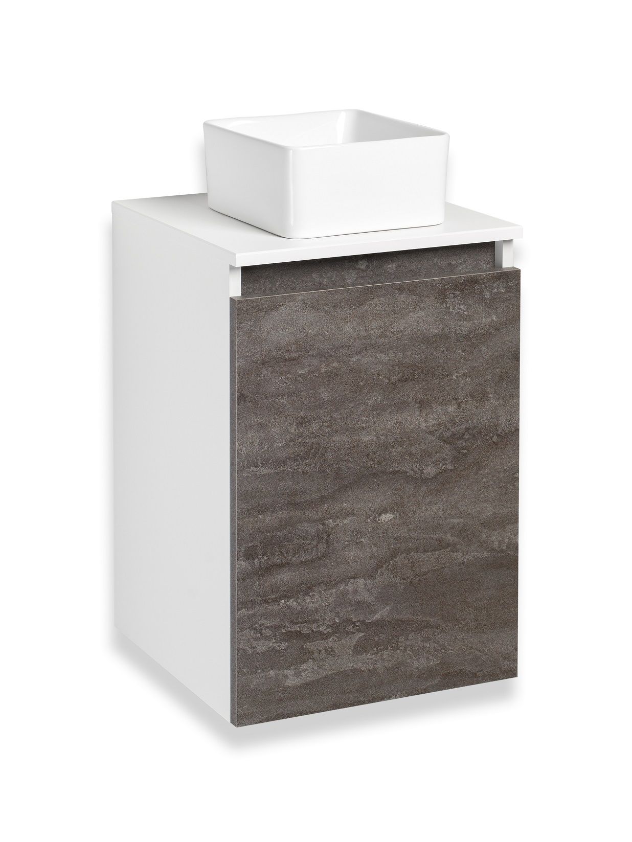 Тумба под раковину в ванную RUNO БАРИ (подвесная) - безупречное сочетание модных тенденций с классическим оформлением ванной комнаты. Тумба под раковину БАРИ оснащена распашной дверцей с правым открыванием. Цвет корпуса классический - белый, при этом цвет фасада в модном цвете – железный камень, идеально впишутся в любой интерьер ванной комнаты. К тумбе для ванной подойдут умывальники на столешницу: «UNO 24» (24х24см) – очень маленькая модель, идеально подходит для ограниченного пространства в небольших помещениях. Строгая квадратная геометрически правильная форма раковины, усиливает идею лаконичности в дизайне, устанавливается на столешницу, накладным методом. «DUE 38» (38х24см) – маленькая модель, идеально подходит для ограниченного пространства в небольших помещениях. Строгая прямоугольная геометрически правильная форма раковины с округлыми углами, усиливает идею лаконичности в дизайне, устанавливается на столешницу, накладным методом.
