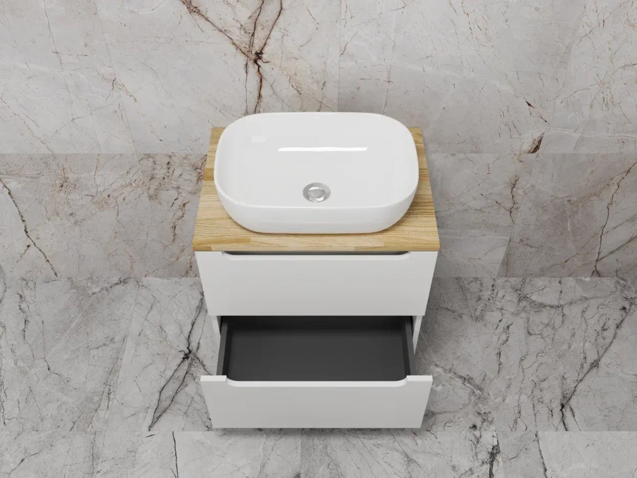 Столешница из натурального ясеня толщиной 20 мм покрыта матовым влагостойким лаком. Фасады и корпус в матовой пленке SOFT TUOCH. Внутренне наполнение из ЛДСП в декоре ГРАФИТ с эргономичным ограничителем под сифон. Фасады без ручек с лаконичным вырезом для комфортного открывания. Выдвижные ящики с системой плавного закрывания SOFT CLOSE. Экологичные и влагостойкие материалы. Легкость в уходе, практичность и стильный внешний вид.