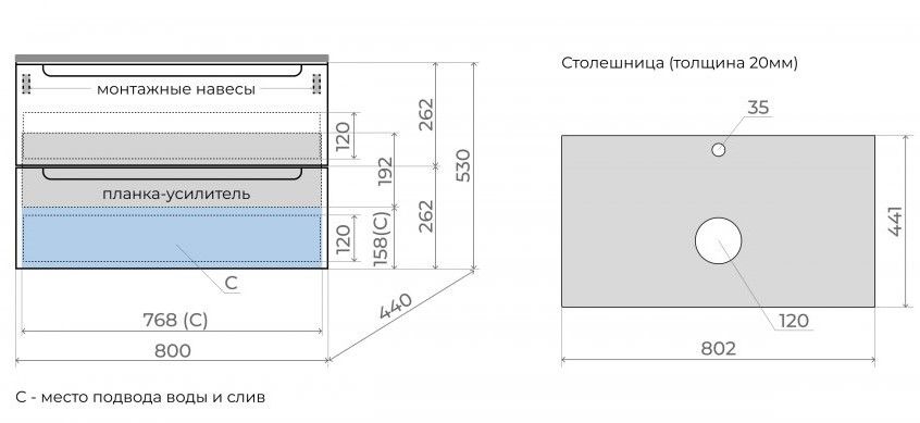 - Тумба подвесная со столешницей (ш/г/в): 800x450x530 мм