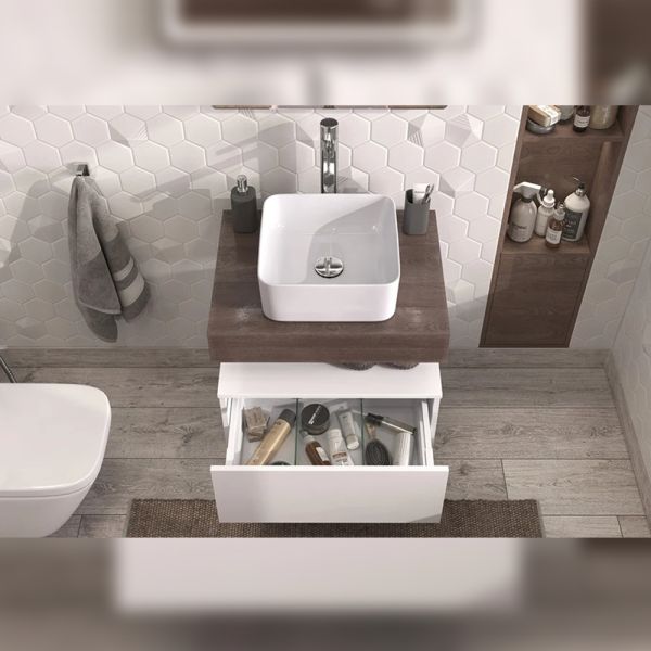 Тумба подвесная без столешницы Velvex Unit tp.UNI.50.1Y белый глянец, 50 см: 1 выдвижной ящик со стеклянными разделителями.