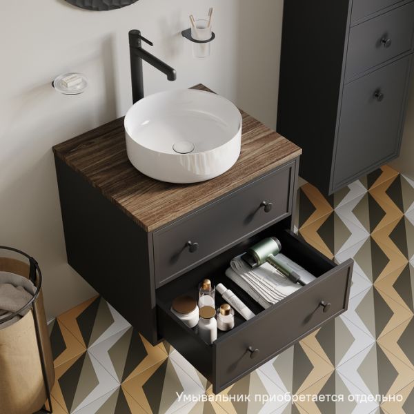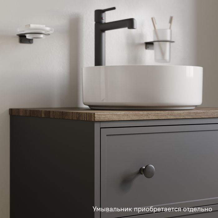 Компактная подвесная тумба Torr трендового темно-серого цвета со столешницей из МДФ в оттенке ореха макадамия. Сочетает в себе узнаваемый стиль и практичность популярного скандинавского дизайна. Ее четкие формы, теплый цвет дерева, фасады с декоративной филенкой, круглые ручки смотрятся гармонично и впишутся в любой современный интерьер. Подойдет любой накладной умывальник, покупается отдельно.