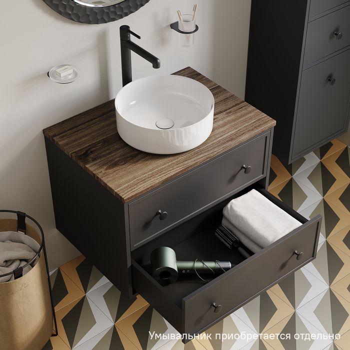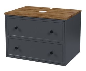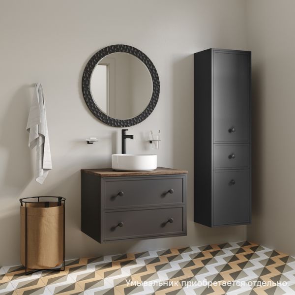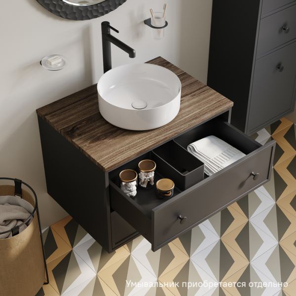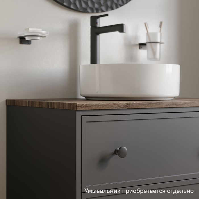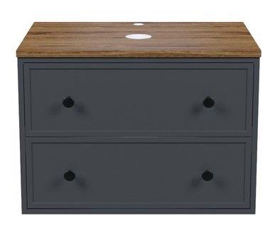 Компактная подвесная тумба Torr трендового темно-серого цвета со столешницей из МДФ в оттенке ореха макадамия. Сочетает в себе узнаваемый стиль и практичность популярного скандинавского дизайна. Ее четкие формы, теплый цвет дерева, фасады с декоративной филенкой, круглые ручки смотрятся гармонично и впишутся в любой современный интерьер. Подойдет любой накладной умывальник, покупается отдельно.
