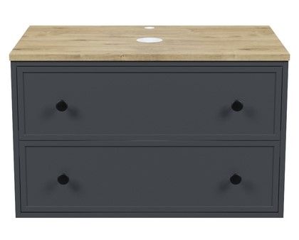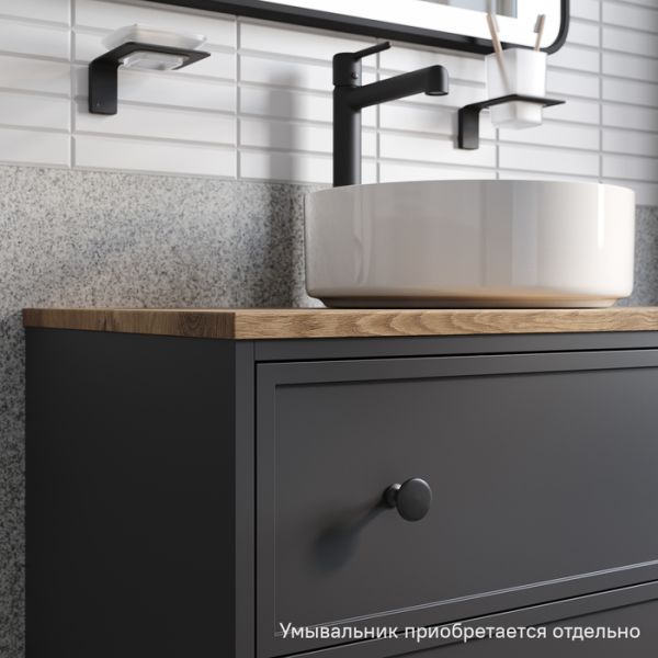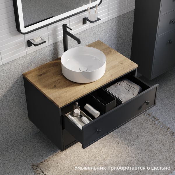 Вместительная подвесная тумба Torr трендового темно-серого цвета со столешницей из МДФ в оттенке дуба верона. Сочетает в себе узнаваемый стиль и практичность популярного скандинавского дизайна. Ее четкие формы, теплый цвет дерева, фасады с декоративной филенкой, круглые ручки смотрятся гармонично и впишутся в любой современный интерьер. Подойдет любой накладной умывальник, покупается отдельно.