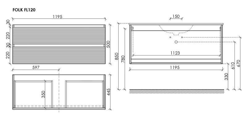 Тумба подвесная с двумя выдвижными ящиками с доводчиками скрытого монтажа