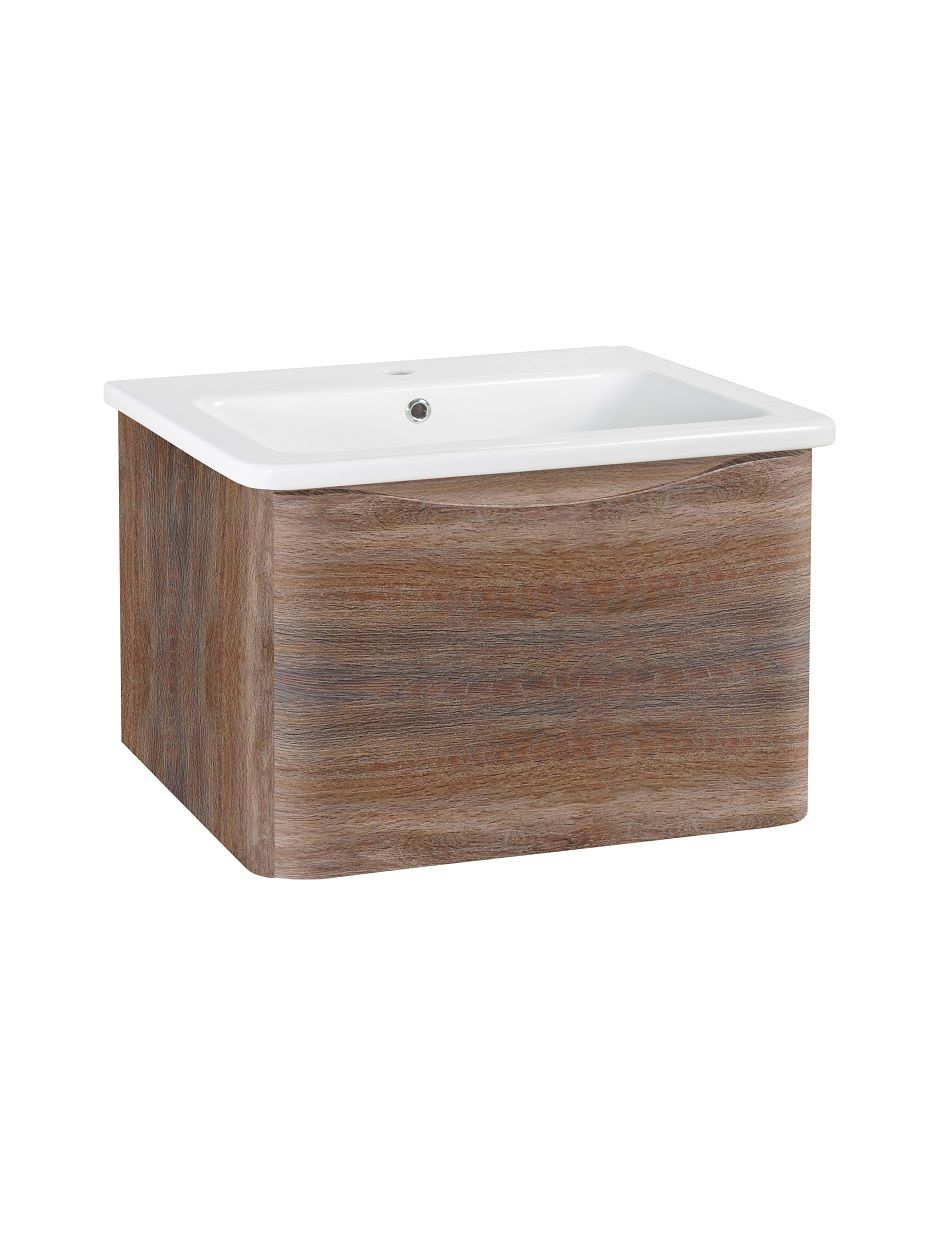 Тумба с раковиной в ванную Runo Тоскана (подвесная) - выполнена в ультрасовременном дизайне в цвете темное дерево. Тумба под раковину отличается изысканным дизайном, скруглённые углы тумбы, древесная текстура фасада, врезная ручка – придают мебели необычный и незабываемый внешний вид. Тумба в ванную оснащена выдвижным ящиком на шариковых направляющих, с системой плавного закрывания. Тумба под раковину ТОСКАНА гармонично впишется в любой интерьер ванной комнаты. Тумба для ванной комплектуется накладным керамическим умывальником Никсон 60 (600х460 мм) ТМ Dreja, необычный дизайн которого сочетание строгих линий прямоугольника со скруглёнными углами, отражают современные тренды в дизайне. Раковина глубиной 16 см. Мебель для ванной комнаты RUNO - красота и практичность в мелочах!