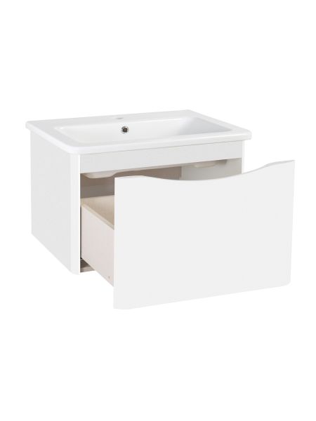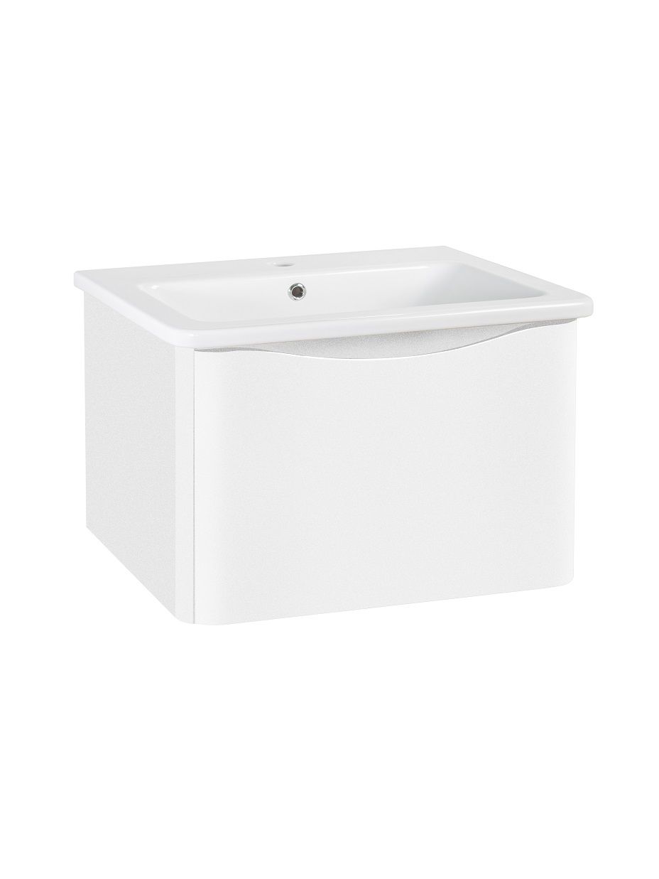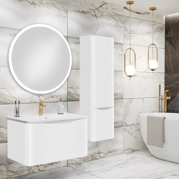 Тумба с раковиной в ванную Runo Тоскана (подвесная) - выполнена в ультрасовременном дизайне в классическом белом цвете. Тумба под раковину отличается изысканным дизайном, скруглённые углы тумбы, древесная текстура фасада, врезная ручка – придают мебели необычный и незабываемый внешний вид. Тумба в ванную оснащена выдвижным ящиком на шариковых направляющих, с системой плавного закрывания. Тумба под раковину ТОСКАНА гармонично впишется в любой интерьер ванной комнаты. Тумба для ванной комплектуется накладным керамическим умывальником Никсон 80 (800х460 мм) ТМ Dreja, необычный дизайн которого сочетание строгих линий прямоугольника со скруглёнными углами, отражают современные тренды в дизайне. Раковина глубиной 16 см. Мебель для ванной комнаты RUNO - красота и практичность в мелочах!