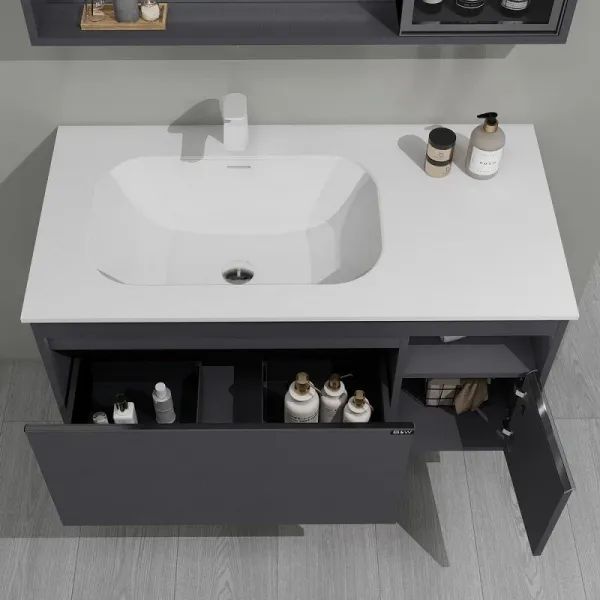 Новинка датского бренда Black&White в габаритных размерах 100×52 см.В концепции изделия лежит свободное пространство для хранения косметических принадлежностей, а также трендовое направление в создании мебели для ванной комнаты – смещение чаши для расширения полезной площади на столешнице. Корпус изготовлен из девятислойной фанеры и окрашен эмалью серого цвета, такая комбинация позволяет сделать корпус максимально влагостойким. Раковина — столешница производится из искусственного камня на основе минералов-Corian. Материал не обладает пористостью, а также приятен тактильно. Фурнитура для открывания ящиков установлена компании UniHopper с доводчиками. U 910 продукт с широким функционалом и эргономикой, который наполнит ванную комнату скандинавским стилем.
