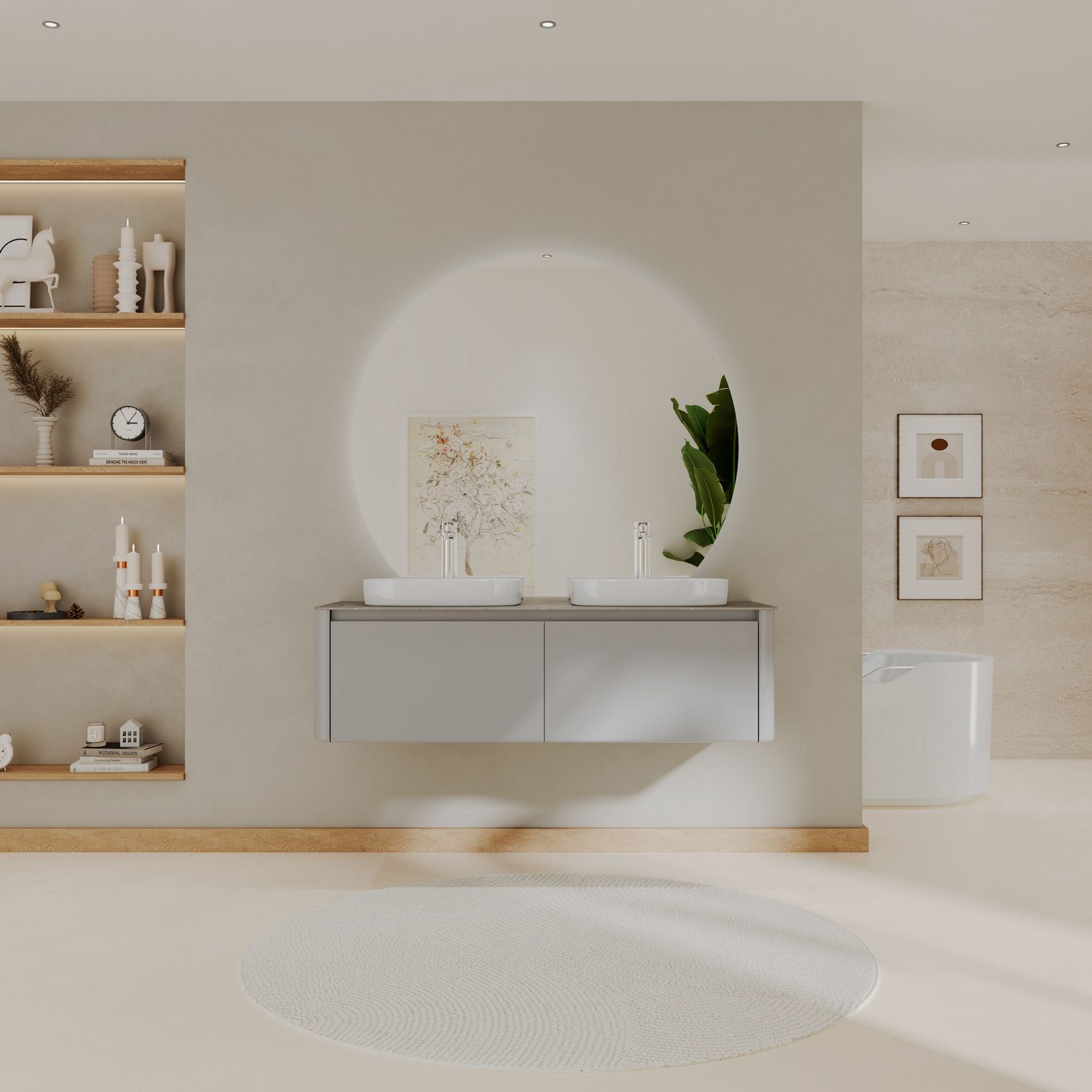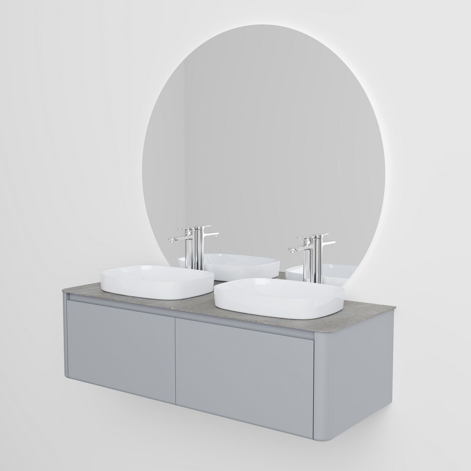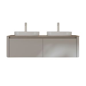 Минималистичная мебель датского производителя Black&White в габаритных размерах 140×55 см. Столешница выполнена из утонченного керамогранита стилизованного под натуральный мрамор с эффектной комбинацией цветов прожилок.Полувстраиваемые раковины поставляются вместе с донным клапаном и изготавливаются из сантехнического фарфора, а невысокие борта позволяют устанавливать смеситель любой высоты. База изготовлена из влагостойкого MDF и покрыта эмалью в цвете glossy light grey ,фурнитура для открывания выдвижных ящиков используется австрийской компании Blum. Комплект крепежа с крепежной планкой идет в комплекте.