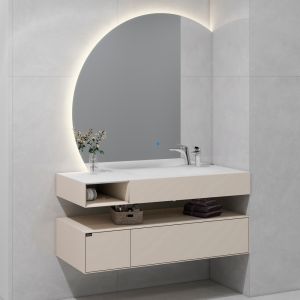 Левосторонняя модульная мебель для ванной комнаты от датского производителя Black&White в габаритных размерах 120x52x35 см.Угловая концепция со смещенной раковиной – столешницей из не пористого искусственного камня на основе природных минералов Corian– позволяет комфортно разместить косметические принадлежности рядом с чашей, также слив комплектуется донным клапаном в цвете хром. База как и модуль под раковиной изготовлен из девятислойной влагостойкой фанеры и окрашена эмалью для насыщенного цвета и лучшей изоляции от влаги основания изделия. Для хранения предусмотрены два выдвижных ящика на фурнитуре компании UniHoppr с доводчиками и открытая ниша в модуле под раковиной.U 955– продукт инновационных решений и функционала от датских дизайнеров, который наполнит Вашу ванную комнату уютом и скандинавским стилем.