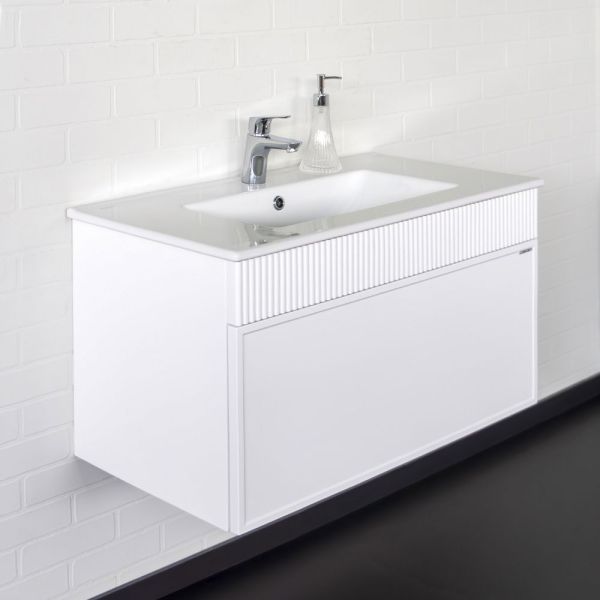Комплектация: керамическая раковина Comforty 80EПодвесная тумба с одним большим выкатным ящиком оборудованным направляющими с системой плавного закрывания. Корпус тумбы изготовлены из влагостойкого ЛДСП. Фасад тумбы из МДФ фрезерован кантом по периметру. Подпорная царга фрезерована вертикальным узором. Корпус и фасад тумбы окрашены белой матовой эмалью. Тумба подготовлена для подключения водоснабжения снизу и сзади.