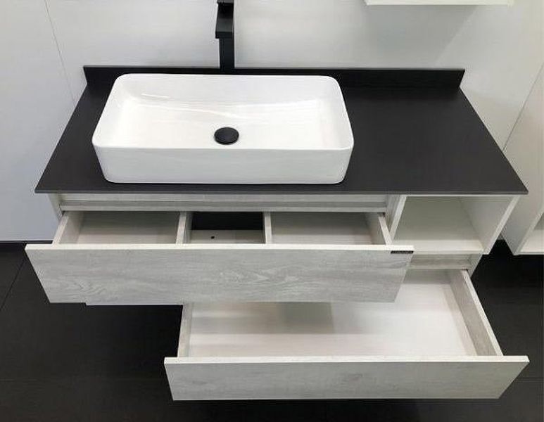 Тумба с раковиной Comforty Прага 00-00014834 120 см Дуб белыйТумба-умывальник в современном стиле с двумя выкатными ящиками и пространством для открытого хранения. Ящики оснащены направляющими с системой с плавного закрывания. Тумба укомплектована столешницей и плинтусом из керамогранита цвета графит.Характеристики:Тумба:Цвет: дуб белый.