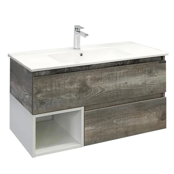Тумба с раковиной Comforty Турин 00-00013940 90 см дуб бежевыйХарактеристики: Цвет: дуб бежевый, белый глянцевый. Материал тумбы: влагостойкий ЛДСП. Организация хранения: два ящика, открытая полка. Ящики оборудованы системой плавного закрывания. Монтаж-подвесной. Раковина: Цвет: белый. Материал: санфарфор. Форма: прямоугольная. Одно отверстие под смеситель. Отверстие под перелив. В комплекте поставки: тумба, раковина 90E, крепежный комплект