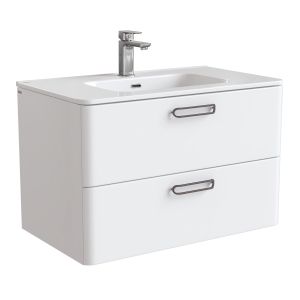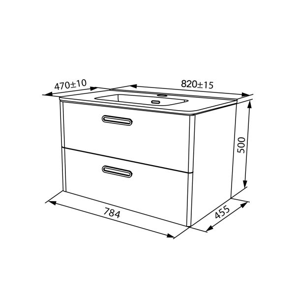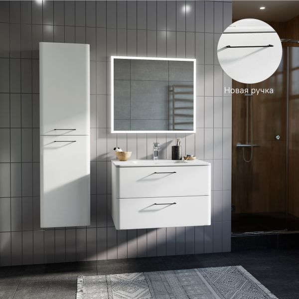 Тумба с умывальником для ванной комнаты, подвесная. Размеры тумбы без умывальника: 467х802х500 мм (ДхШхВ). Размеры умывальника: 460х800 мм (ДхШ). Фасад МДФ 19 мм в эмали (белый глянец). Корпус влагостойкий ВЛДСП 16 мм в эмали. Ручки - цвет состаренное олово. Два выдвижных ящика с механизмом плавного доведения. Пластиковый ограничитель под сифон в верхнем ящике. Перекатной организатор в нижнем ящике. Навесы усиленные с планкой. Упаковка: картон, пленка, пенопластовые уголки.