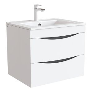 Тумба с умывальником для ванной комнаты, подвесная. Размеры тумбы без умывальника: 455х603х500 мм (ДхШхВ). Размеры умывальника: 465х600х175 мм (ДхШхВ). Фасад МДФ 19 мм в эмали (белая), фрезеровка. Корпус влагостойкий ЛДСП 16 мм в эмали. Интегрированные ручки. Два выдвижных ящика с механизмом плавного доведения. Пластиковый ограничитель под сифон в верхнем ящике. Перекатной организатор в нижнем ящике. Навесы усиленные с планкой. Упаковка: картон, пленка, пенопластовые уголки.