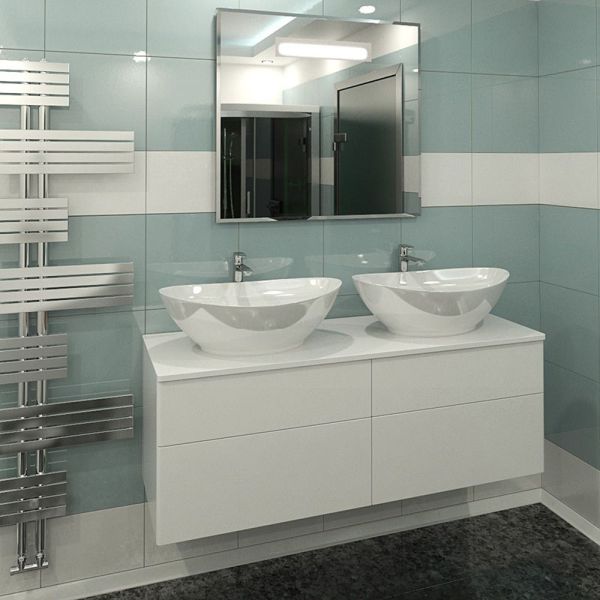 Подвесная тумба с двумя раковинами и столешницей МДФ, с четырьмя выдвижными ящиками. Предназначена для использования в ванных комнатах с повышенной влажностью. Система Push to Open: ящики открываются нажатием на них. Высокое качество сборки, материалов и фурнитуры. Столешница, корпус и фасад: МДФ, плёнка ПВХ белая глянцевая. Раковины накладные (глубина 10 см) - фаянс.